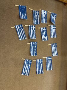 Υπάρχουν πολλές και διάφορες εκδοχές, οι οποίες προσπαθούν να αποκρυπτογραφήσουν το νόημα των δύο χρωμάτων Εμείς μάθαμε την ιστορία της Γαλάτειας Γρηγοριάδου Σουρέλη και έπειτα φτιάξαμε ατομικές σημαίες με τύπωμα σφουγγαριού