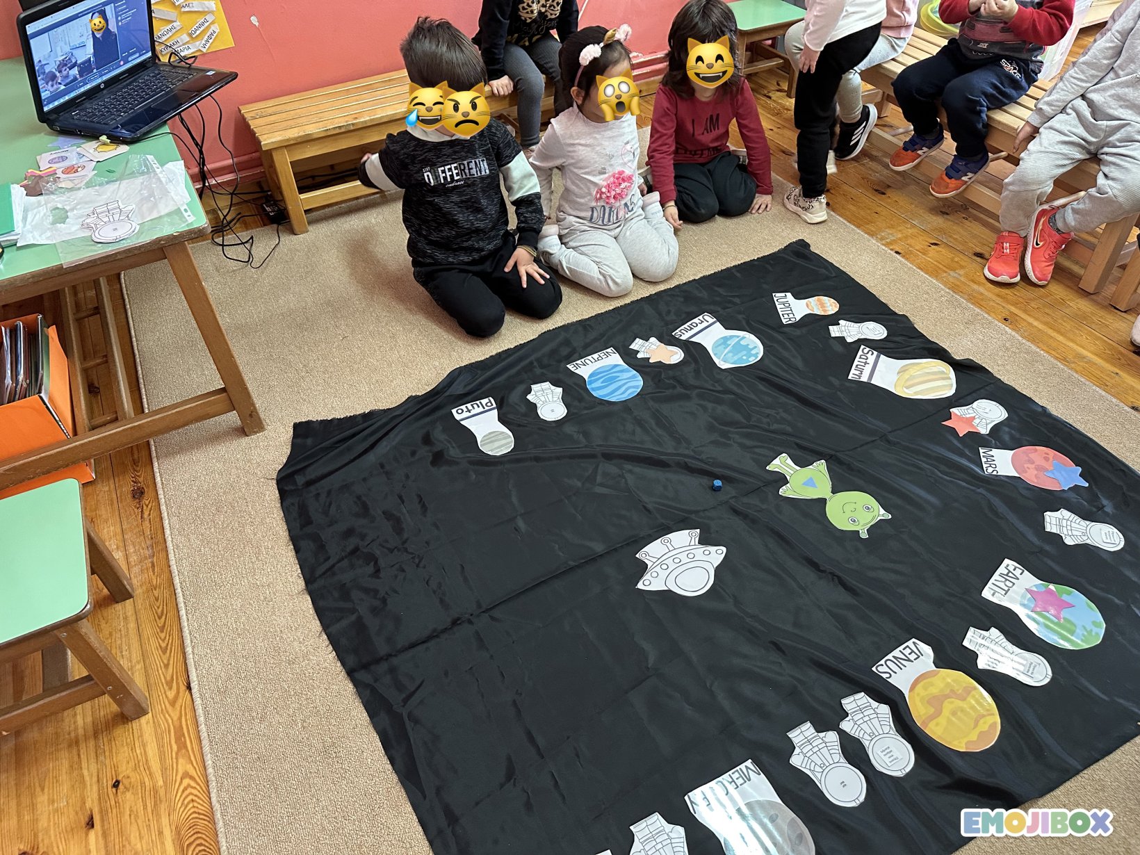 Τα παιδιά του Νηπιαγωγείου Αγίου Δημητρίου παρουσίασαν με μεγάλο ενθουσιασμό ένα επιτραπέζιο παιχνίδι που δημιούργησαν με θέμα το Διάστημα. Το παιχνίδι περιλάμβανε πλανήτες, αστέρια και ερωτήσεις εμπνευσμένες από τη μυθολογία και τις διαστημικές αποστολές. Επιπλέον, τραγούδησαν όλοι μαζί το τραγούδι *”Στη Γειτονιά του Ήλιου”*, γεμίζοντας τη συνάντηση με χαρά και μουσική.