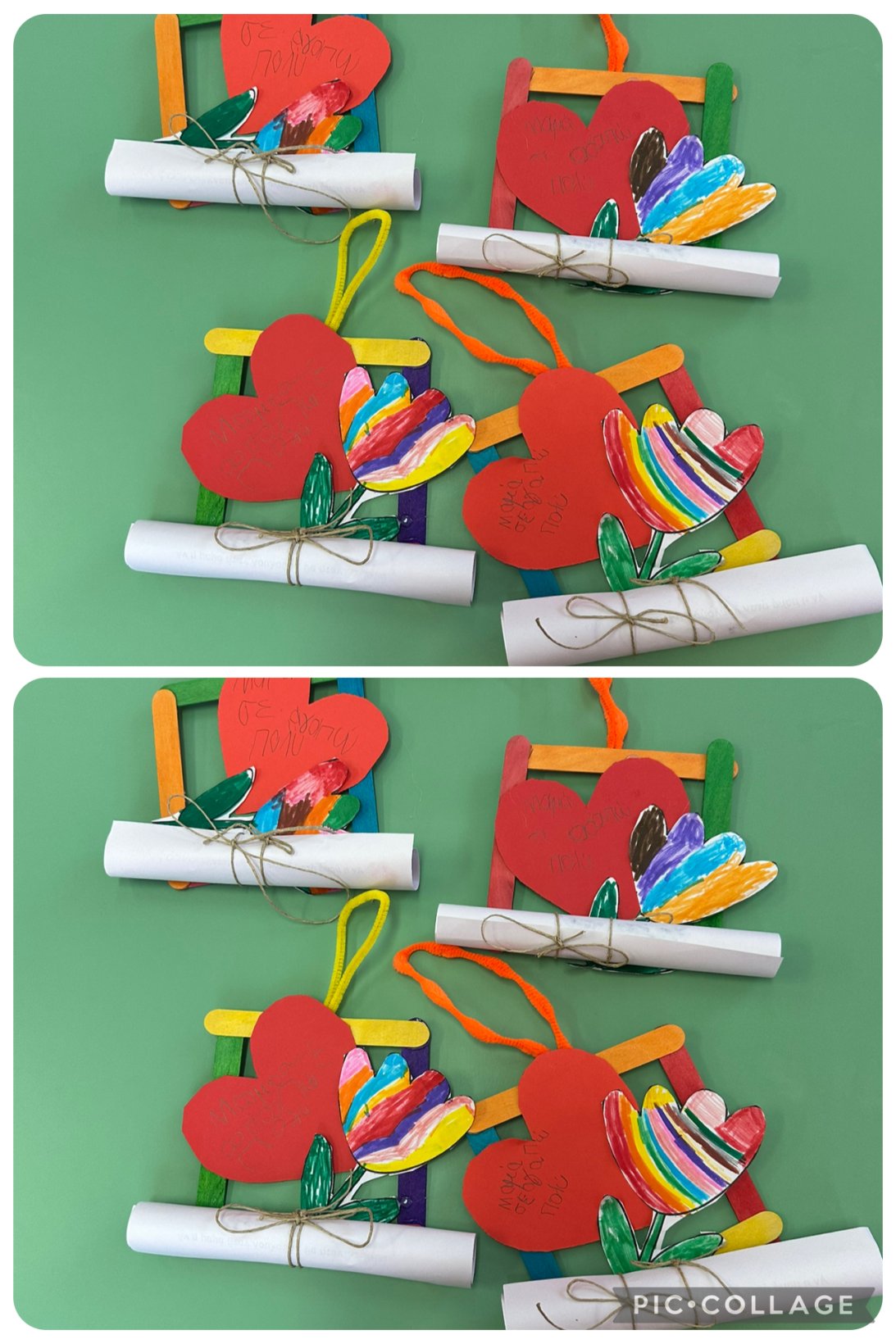 Παράλληλα, φτιάξαμε και τις καρδιές της παρέας μας: κάθε παιδί άφησε το δαχτυλικό του αποτύπωμα πάνω σε μια καρδιά — μία καρδιά για κάθε παιδί της τάξης, γεμάτη χρώματα και αγάπη! Έτσι, δημιουργήσαμε ένα μοναδικό ενθύμιο με τα «ίχνη» όλων μας, για να θυμόμαστε τους συμμαθητές μας και τη ζεστή ομάδα που γίναμε αυτή τη χρονιά.
