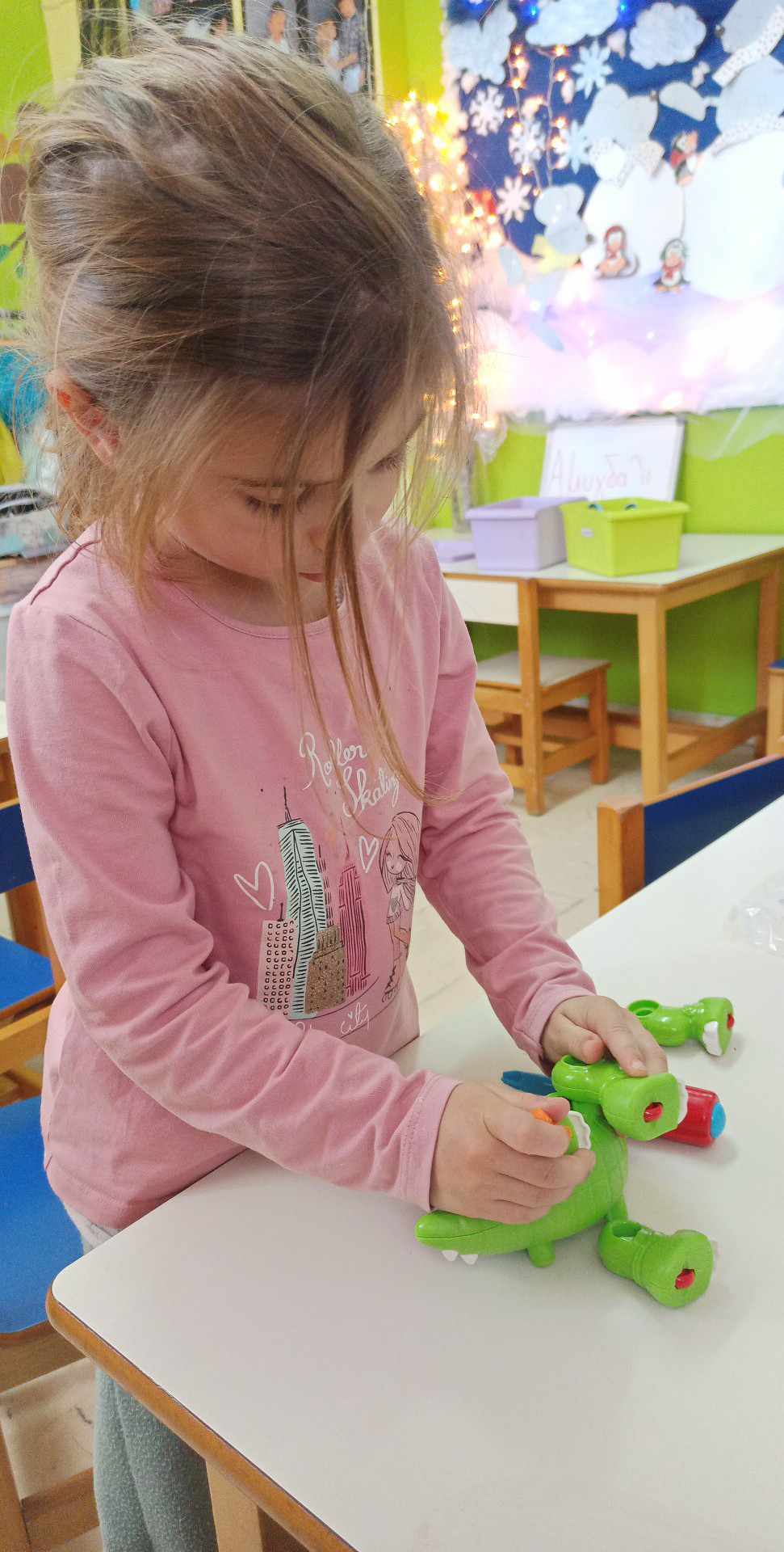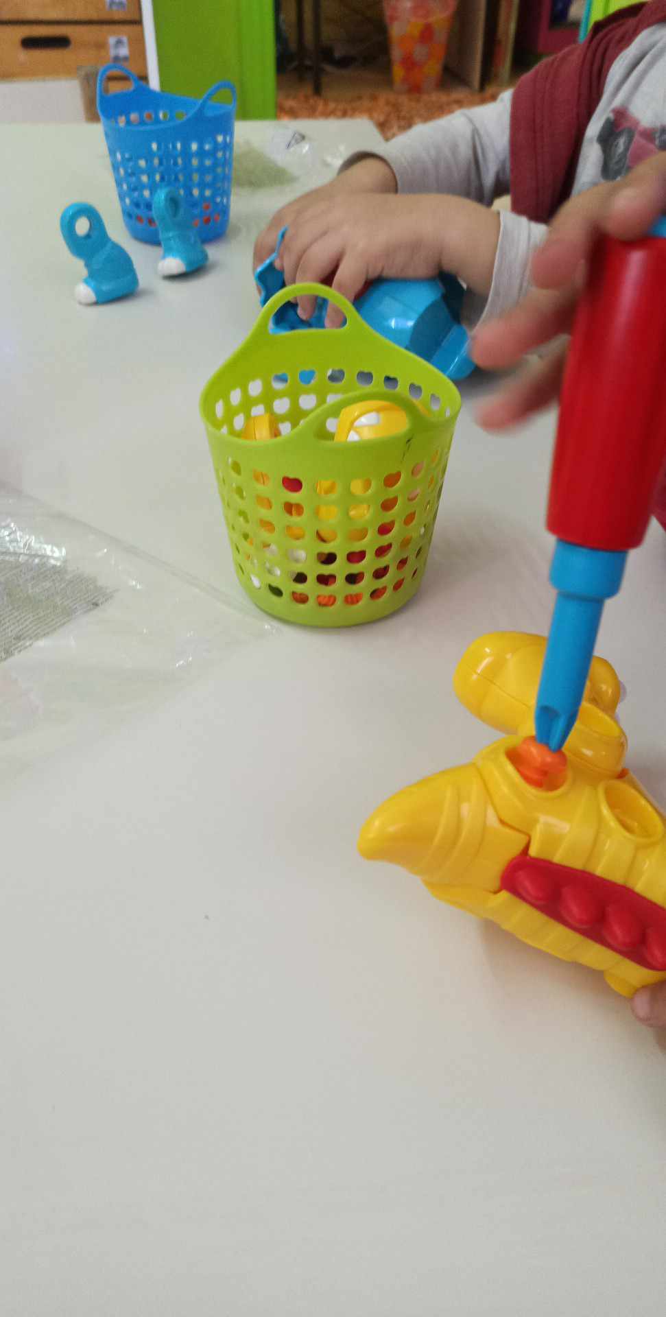 Ανάπτυξη λεπτής κινητικότητας μέσω της κατασκευής ρομπότ δεινοσαύρων. Τα νήπια εξοικειώνονται με τη χρήση κατσαβιδιού και βιδών, συναρμολογώντας τα μικρά κομμάτια. Δεξιότητες που αναπτύσσονται: λεπτή κινητικότητα, σύνθεση, οργάνωση, ομαδοποίηση.