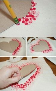 Κόβουμε μια καρδιά από σκληρό χαρτόνι και την βάζουμε σε ένα λευκό χαρτόνι κάνσον, περίπου στο κέντρο. Καλό είναι να τη στερεώσουμε με κάποιο πρόχειρο τρόπο (διπλωμένο σελοτέιπ) για να μην κουνιέται. Σε ένα πλαστικό πιατάκι βάζουμε κόκκινη μπογιά ή άλλο χρώμα και με τη ανάποδη ενός μολυβιού βάφουμε όπως δείχνει η εικόνα, προσέχοντας να έχει ελάχιστη μπογια πάνω στο μολύβι. Μόλις στεγνώσει το χρώμα αφαιρούμε την καρδιά. Δεν ξεχνάμε να αφήσουμε λίγο χώρο στο κάτω μέρος της κάρτας, να γράψουμε στη μανούλα πόσο την αγαπάμε!