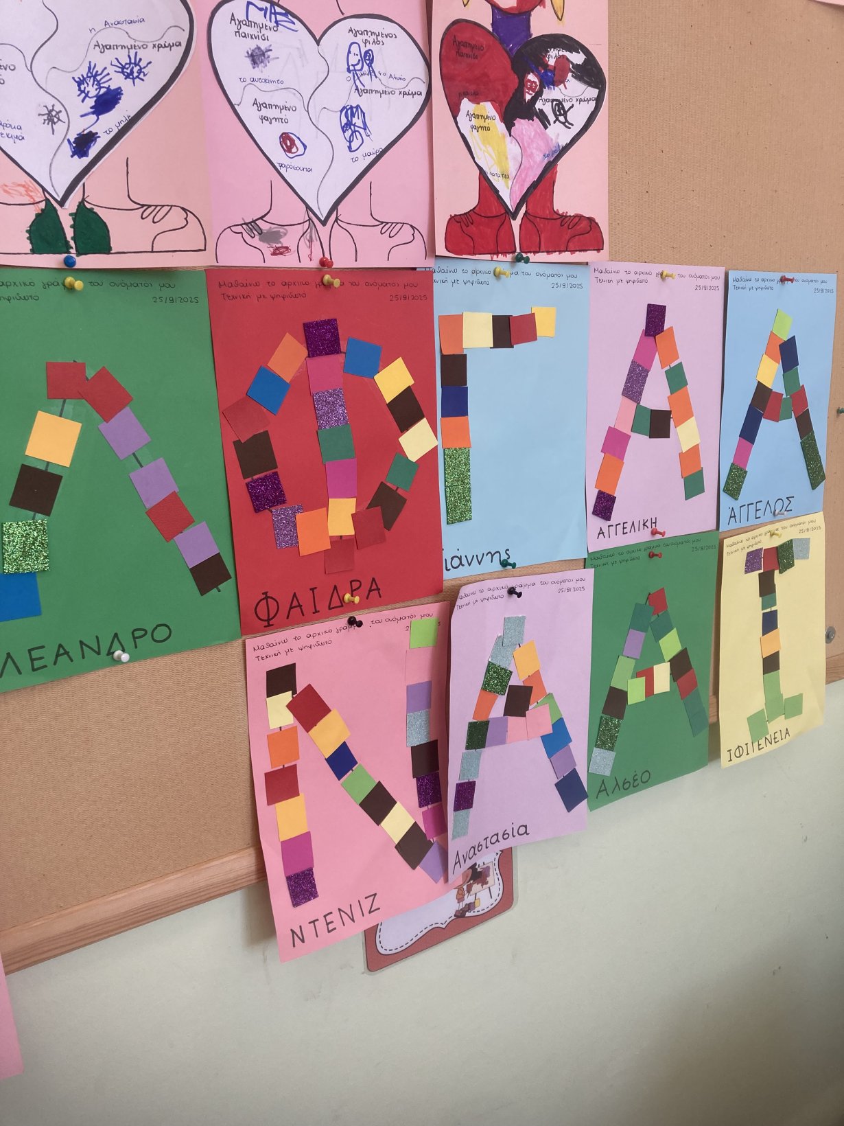 Επεξεργαστήκαμε το όνομά μας,που είναι η ταυτότητα του κάθε παιδιού,καθώς έχει συναισθηματική αξία για κείνο, γι’ αυτό πρόθυμα πειραματίζεται με τις πρώτες γραμμούλες που το απαρτίζουν.