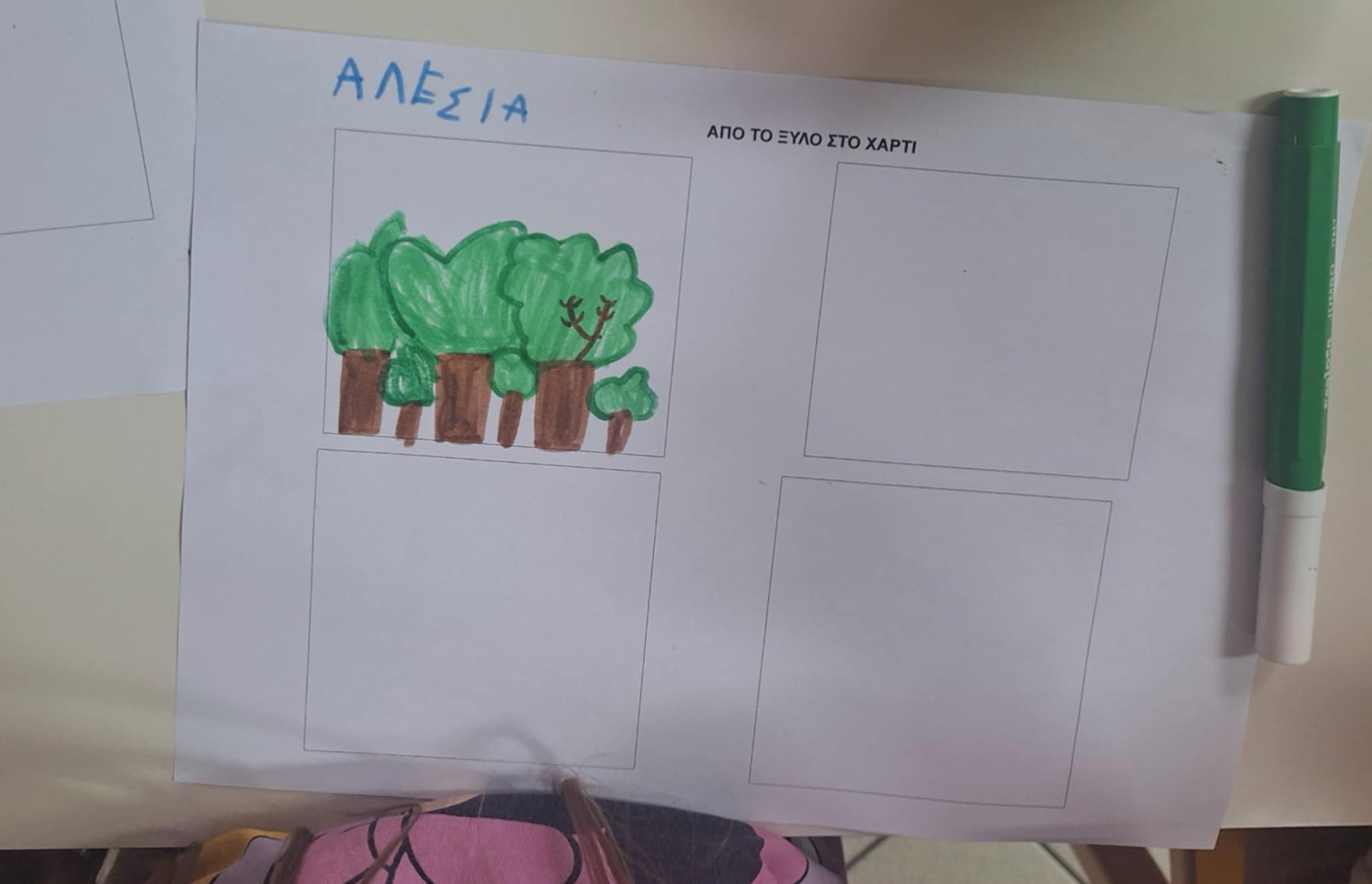 Δημιουργούμε μια σειρά εικόνων που δείχνουν έναν σπόρο να γίνεται δέντρο, το δέντρο να κόβεται (εξηγώντας ότι γίνεται με προσοχή και φυτεύονται νέα δέντρα), το ξύλο να γίνεται χαρτί, το χαρτί να