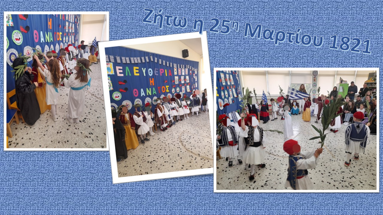 Παραμονή της επετείου, πραγματοποιήθηκε στο σχολείο μας, γιορτούλα η οποία ήταν αφιερωμένη στους ήρωες του ’21 που πάλεψαν με ορμή και αποφασιστικότητα,για το αγαθό της Ελευθερίας, βάζοντας για αντίβαρο την ίδια τους τη ζωή!