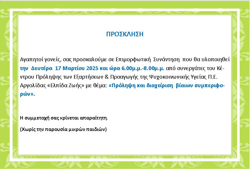 Τη Δευτέρα,17 Μαρτίου,και ώρα 18.00μ.μ-20.00μ.μ διοργανώθηκε επιμορφωτική συνάντηση-ανοιχτή συζήτηση για γονείς και εκπαιδευτικούς, σε συνεργασία με το Κέντρο Πρόληψης των Εξαρτήσεων και Προαγωγής της Ψυχοκοινωνικής Υγείας Π.Ε Αργολίδας «Ελπίδα Ζωής»με θέμα:”Πρόληψη και διαχείριση βίαιων συμπεριφορών”