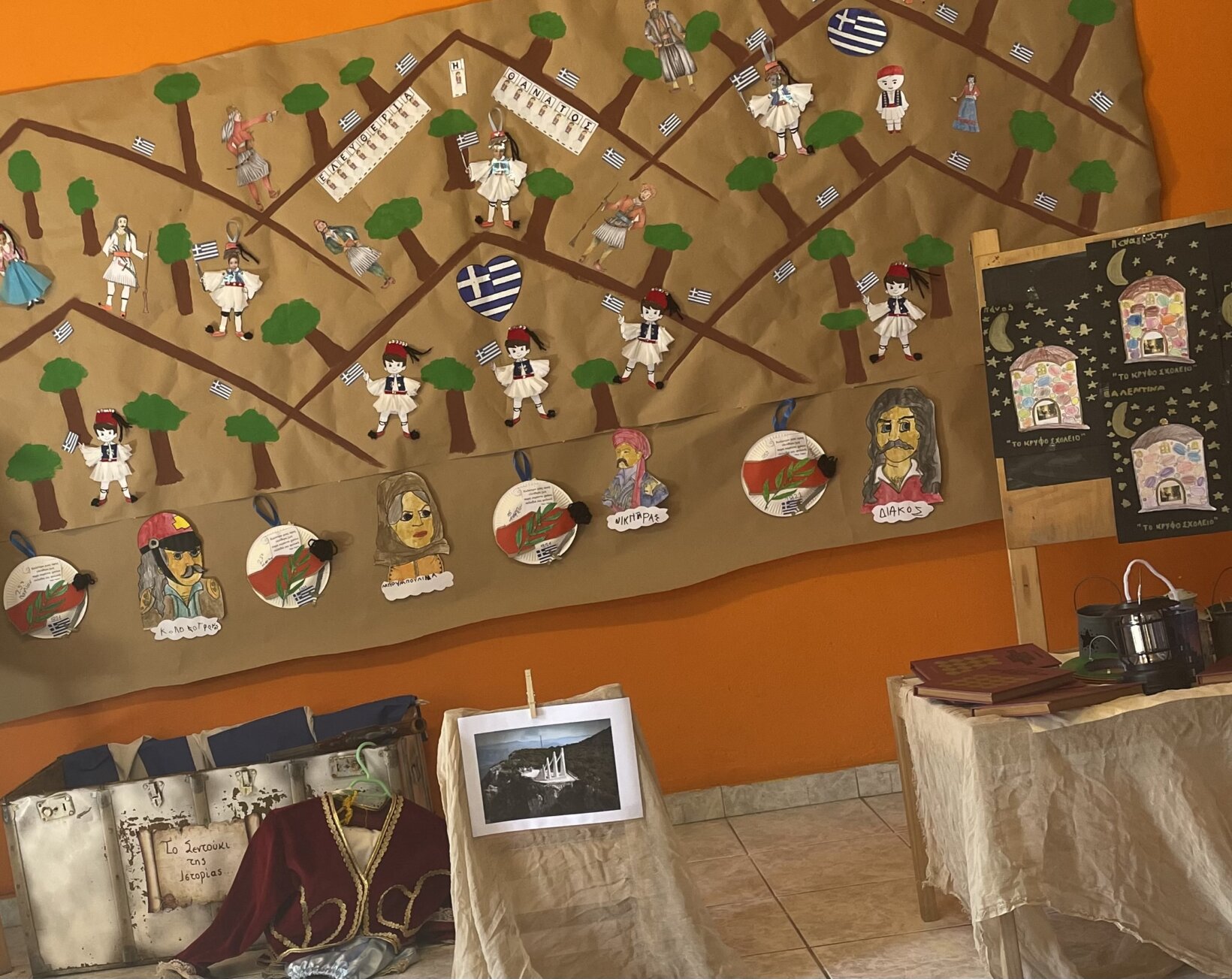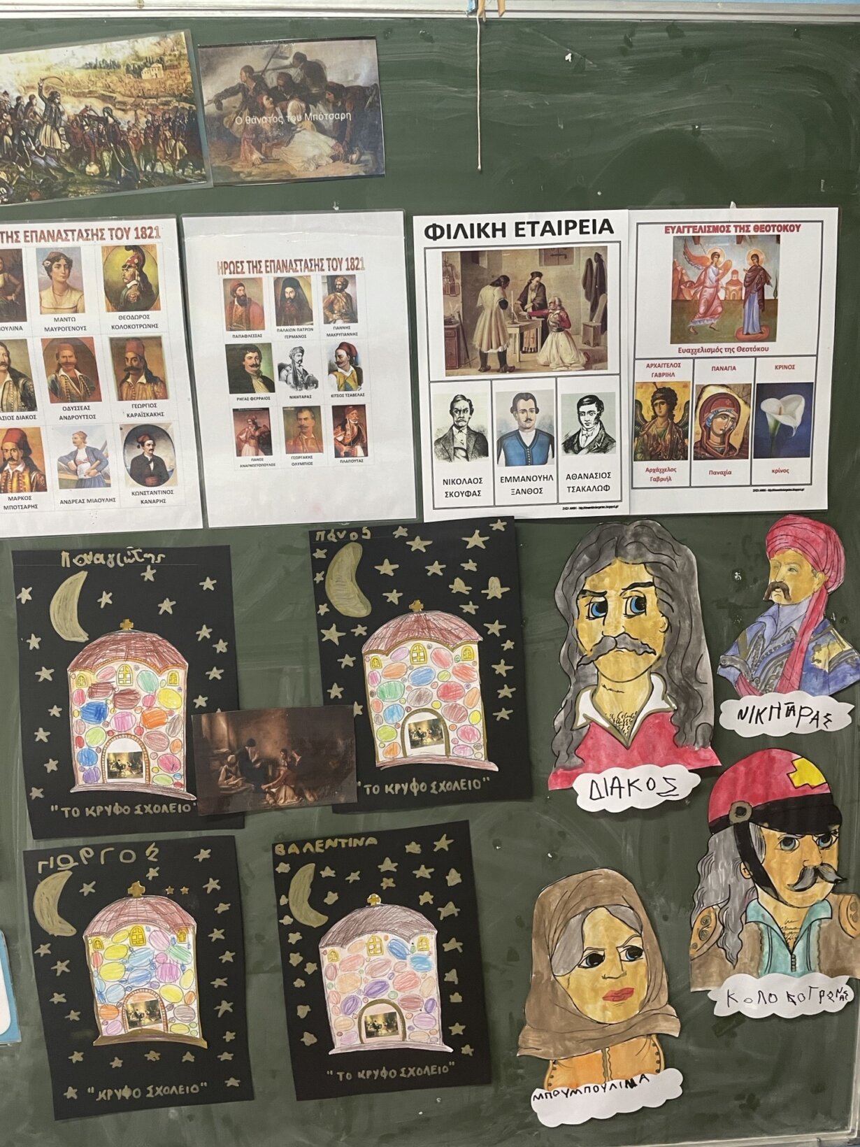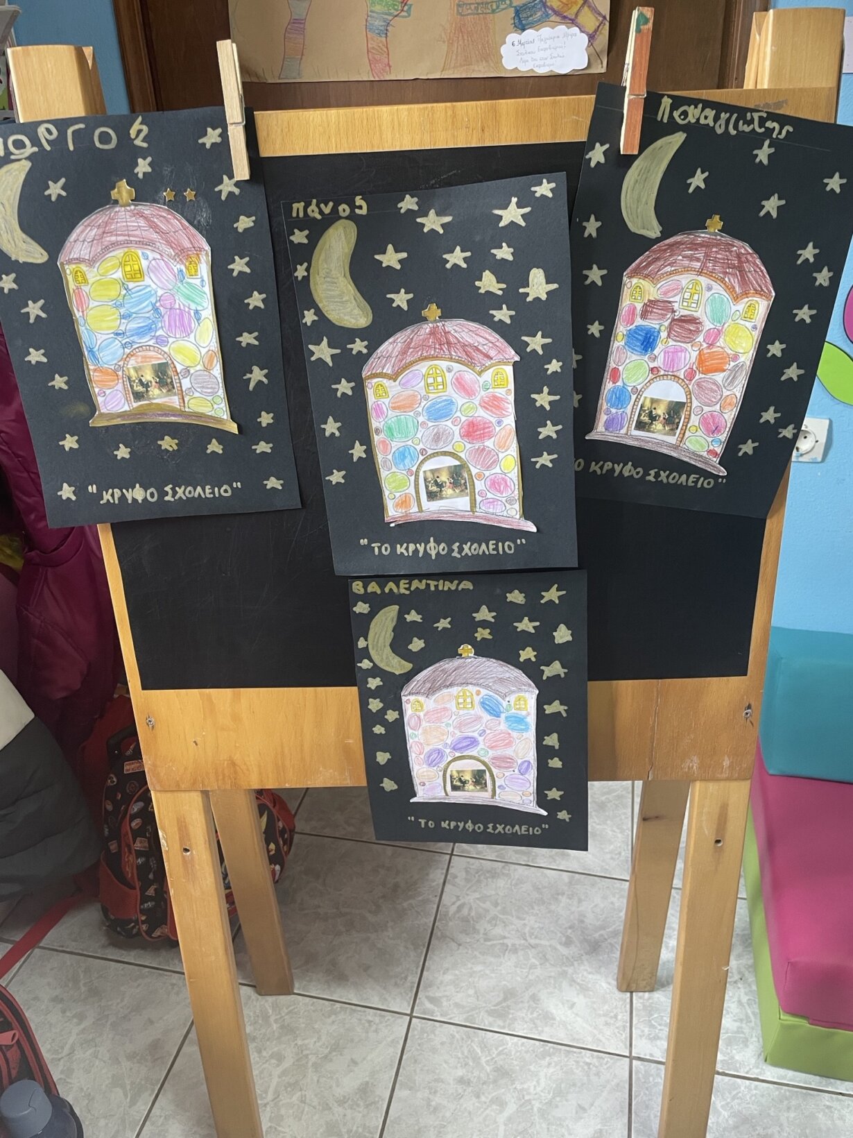 Μιλήσαμε, ακόμη για το κρυφό σχολειό, και ότι τα παιδιά τότε δεν πήγαιναν στο σχολείο, αλλά στην εκκλησία να μάθουν γράμματα, και μάλιστα αργά το βράδυ και τραγουδούσαν στο φεγγαράκι να φέγγει για να τους δείχνει το δρόμο… Είδαμε πίνακες ζωγραφικής με θέμα το κρυφό σχολειό με το γνωστότερο αυτό του ζωγράφου Γύζη και κατασκευάσαμε κι εμείς το δικό μας κρυφό σχολειό.