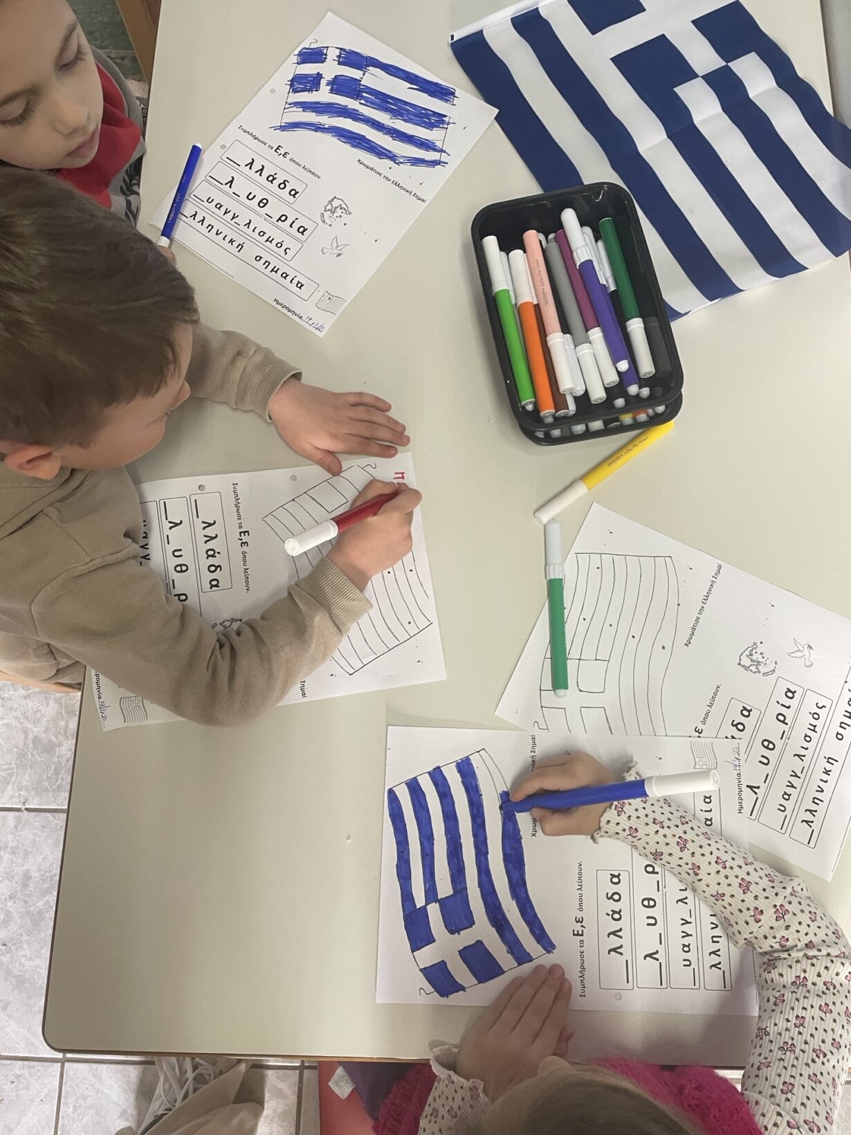 Στη συνέχεια ζωγραφίσαμε την Ελληνική σημαία και μάθαμε το γράμμα Ε της χώρας μας.