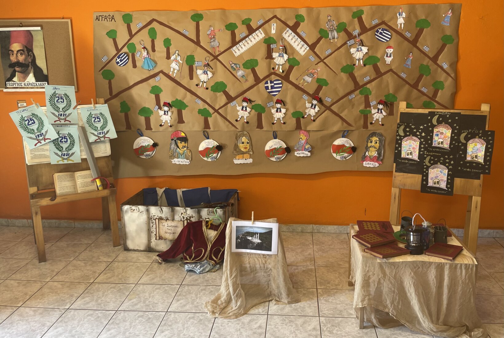 Σχολιάσαμε πως ζούσαν οι Έλληνες σκλαβωμένοι και ότι πλήρωναν το χαράτσι (χρήματα) στους Τούρκους, ώσπου μια μέρα πήραν την απόφαση να επαναστατήσουν … Το παραμύθι μας ενέπνευσε να εργαστούμε ομαδικά, ώστε να φτιάξουμε το σκηνικό για τη γιορτή μας!