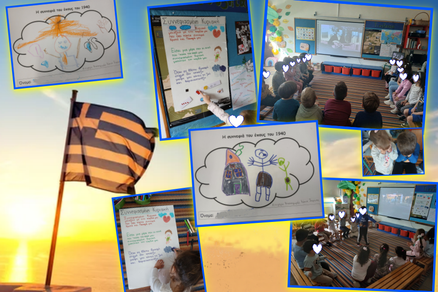 Την ημέρα της γιορτής μας δημιουργήσαμε την ιστοριογραμμή μας, επεξηγήσαμε τις έννοιες του πολέμου, της ειρήνης και της ελευθερίας, χορέψαμε την Συννεφιασμένη Κυριακή και ευχηθήκαμε να μην δούμε ποτέ τέτοιες συννεφιές. Τέλος αναλύσαμε την στάση των ευζώνων στο Σύνταγμα ανά μία ώρα που συμβολίζει το ΟΧΙ. Ολοκληρώσαμε τον εορτασμό με τον Εθνικό μας Ύμνο και την ελπίδα να είμαστε πάντα ελεύθεροι!