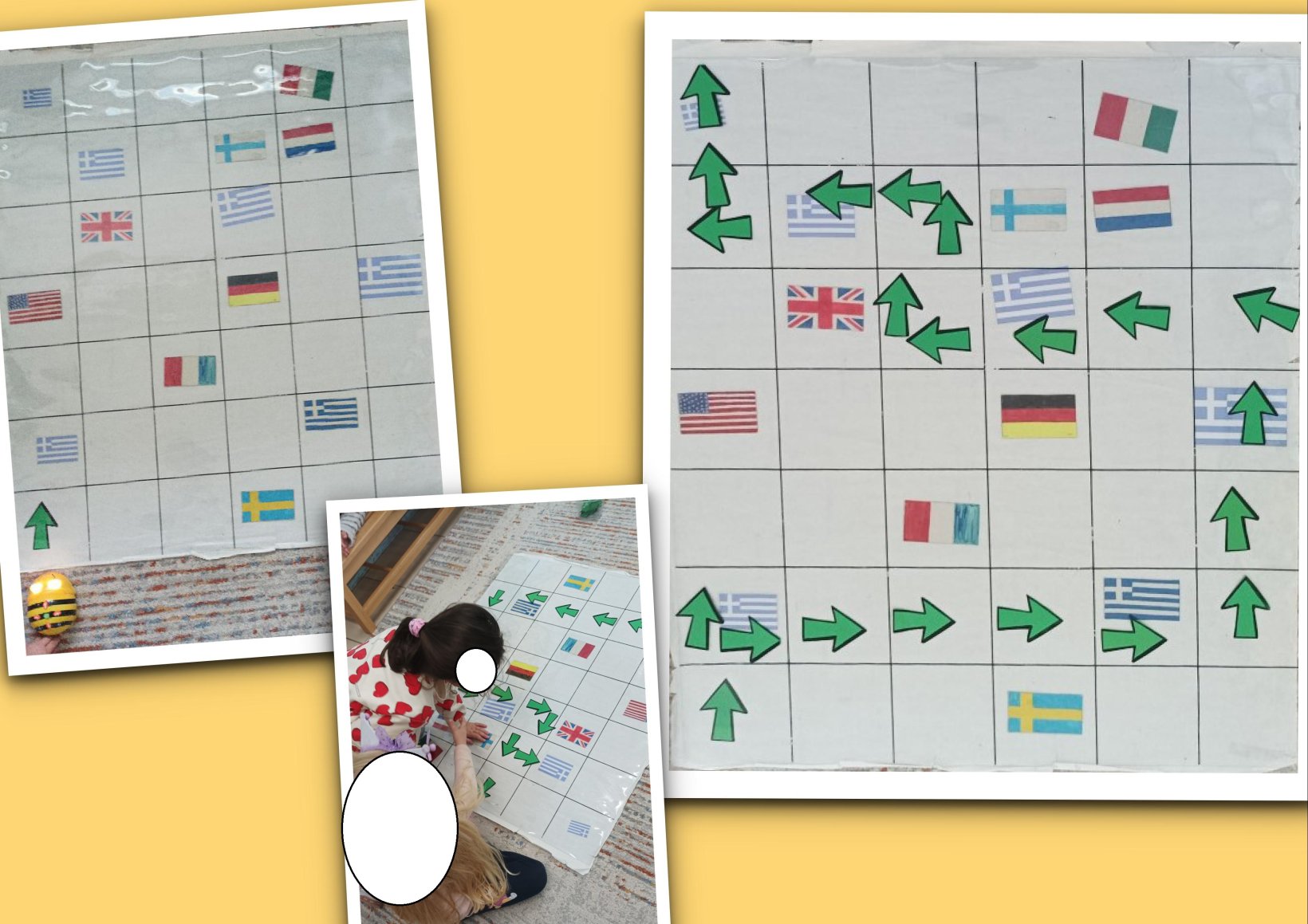 Τα παιδιά καλούνται να προγραμματίσουν το Beebot ώστε να φτάσει σε μία συγκεκριμένη σημαία που θα ονομάζουμε π.χ. “Φτάσε στην ελληνική σημαία” .