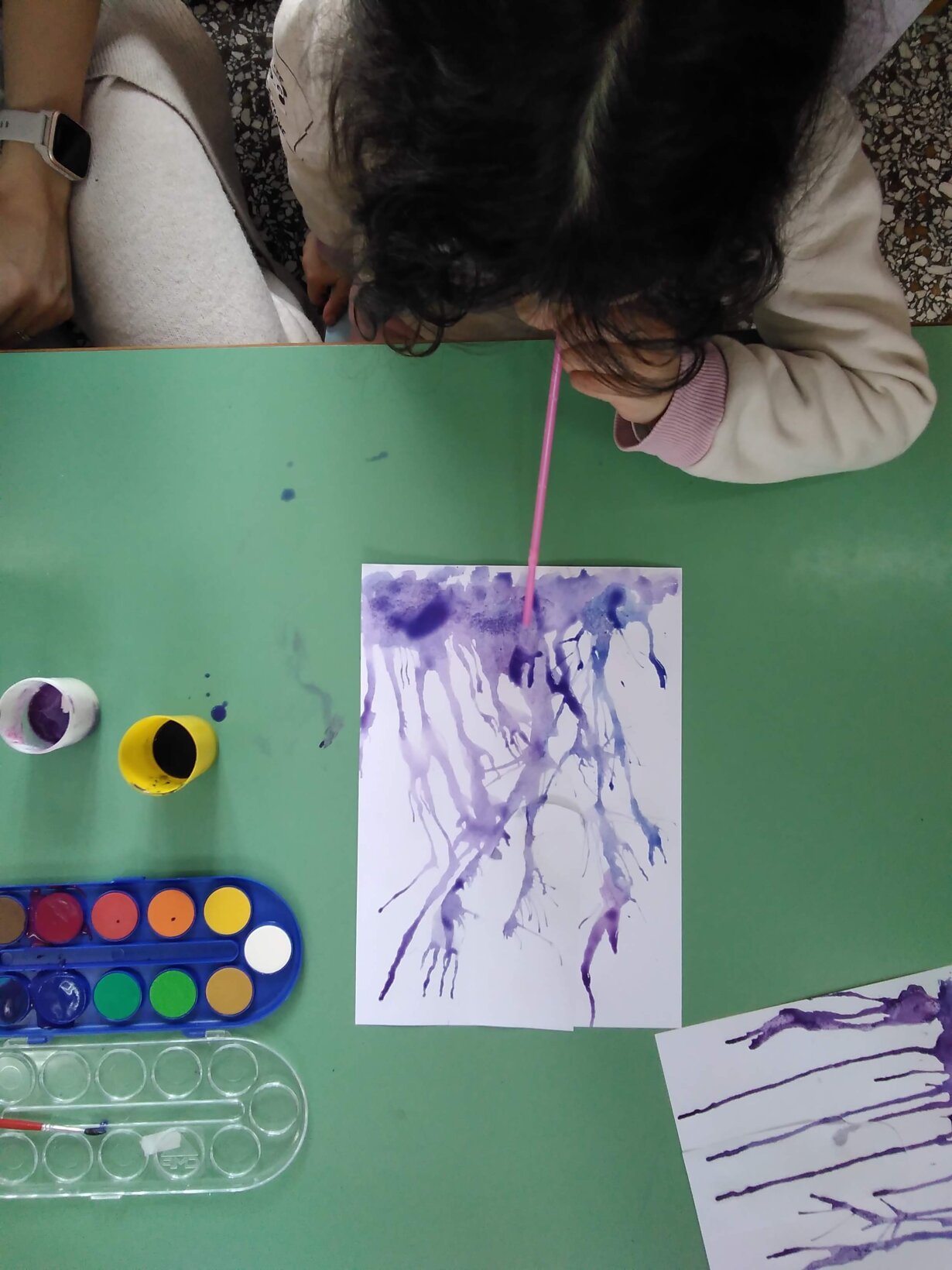 Συζητώντας με τα παιδιά για το τι θα μπορούσαμε να ζωγραφίσουμε καταλήξαμε στην βροχή επηρεασμένοι από τον καιρό. Έτσι αφού προτείναμε ιδέες για το πως θα μπορούσαμε να ζωγραφίσουμε τη βροχή και με ποια υλικά αποφασίσαμε να χρησιμοποιήσουμε την τεχνική όπου τα παιδιά φυσούν με το καλαμάκι τους έτσι ώστε να κατευθύνουν την νερομπογιά .