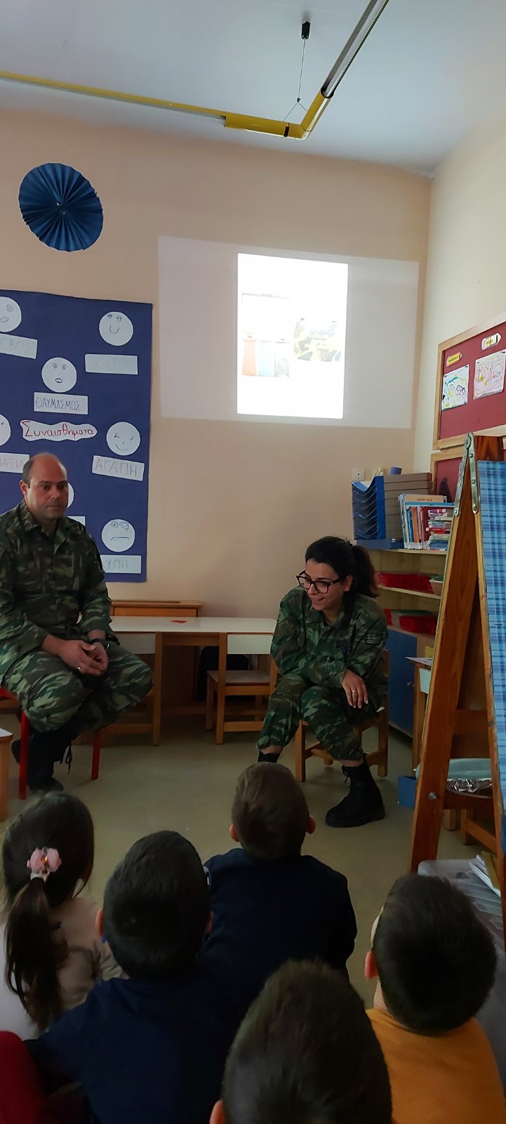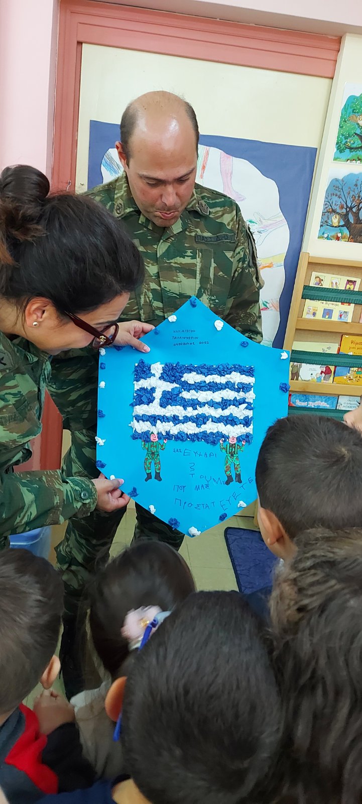 Σήμερα μας επισκέφθηκαν γονείς παιδιού, που και οι δυο είναι στρατιωτικοί. Μας έδωσαν πολλές πληροφορίες και πολλές εξηγήσεις για το ρόλο του στρατού, την εκπαίδευση, την καθημερινότητά τους. Τα παιδιά μας ενθουσιάστηκαν, και τους πρόσφεραν δώρο μια ομαδική εργασία.