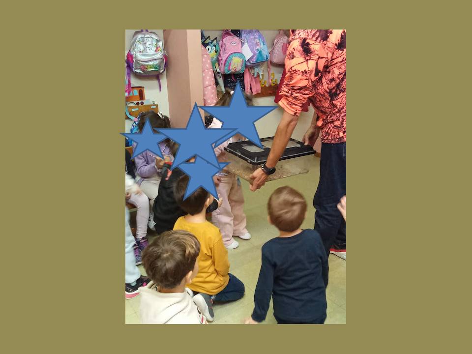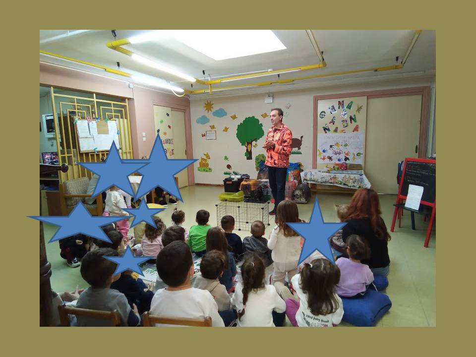 - Στο νηπιαγωγείο μας φιλοξενήσαμε τον κύριο Λευτέρη Λύρατζη, μέλος της Ελληνικής Ομάδας Διάσωσης Καβάλας. Ο κύριος Λευτέρης μίλησε με τα παιδιά, τους ανέφερε τον ρόλο του φορέα, την αξία του εθελοντισμού, και του ενεργού πολίτη. Επίσης, μας έδειξε τι κάνουμε σε περίπτωση σεισμού. Πραγματοποιήσαμε άσκηση σεισμού σε συνεργασία με τον Βρεφονηπιακό Σταθμό Παλαιοχωρίου. Τα παιδιά ενθουσιάστηκαν με όλα αυτά που τους είπε ο κύριος Λευτέρης και του παρέδωσαν ένα δώρο για να μας θυμάται.
