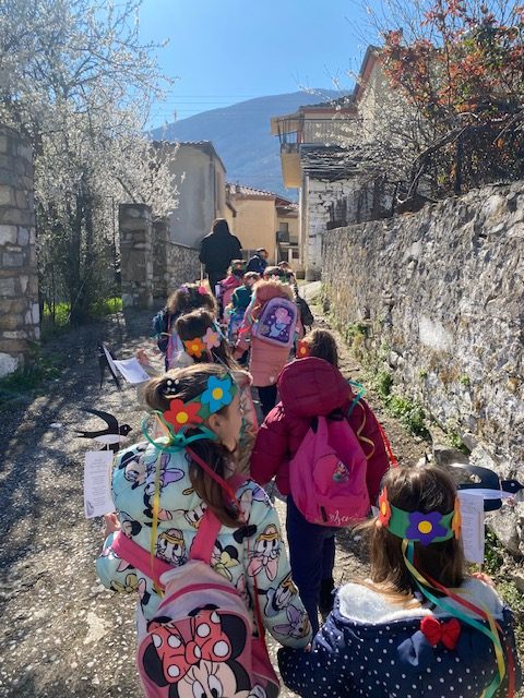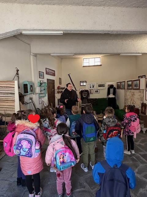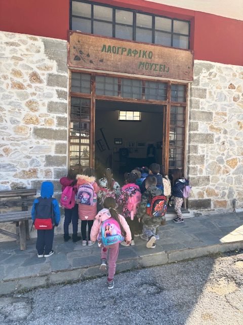 Στην συνέχεια, επισκεφθήκαμε το μουσείο του χωριού όπου ταξιδέψαμε πίσω στον χρόνο και είδαμε παλιά αντικείμενα, εργαλεία καθώς και τον τρόπο διακόσμησης των σπιτιών του χωριού στο παρελθόν. Θα θέλαμε να ευχαριστήσουμε θερμά την εθελοντική ομάδα του πολιτιστικού για την φιλοξενία, καθώς και για τα πολύτιμα πράγματα που μας έδειξαν και μας έμαθαν. Εμείς με την σειρά μας, τους τραγουδήσαμε τα κάλαντα της άνοιξης.