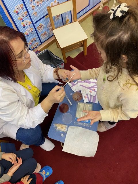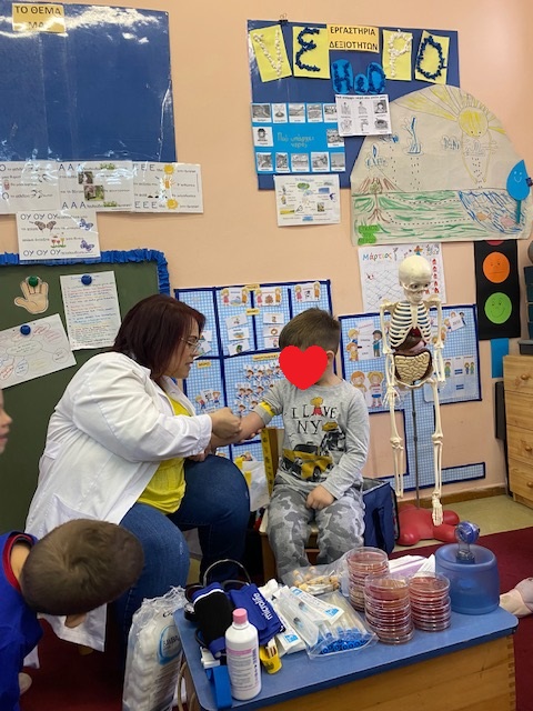 Στα πλαίσια της ενότητας “Το Σώμα μας” καλέσαμε στην τάξη μας την μικροβιολόγο κυρία Ηλιάνα και την συνεργάτη της κυρία Ιωάννα να μας μιλήσουν για το επάγγελμά τους αλλά και για το σώμα μας και τα μικρόβια γύρω μας. Η συγκεκριμένη δράση ανήκει στις βιωματικές δράσεις και τα παιδιά δείχνουν ιδιαίτερο ενδιαφέρον, καθώς όχι μόνο μαθαίνουν για ένα καινούργιο επάγγελμα αλλά μαθαίνουν γιατί είναι σημαντικό να δίνουμε αίμα για εξετάσεις, να μη φοβόμαστε και να μαθαίνουμε πως να προστατευόμαστε από τα μικρόβια που κυκλοφορούν γύρω μας και επάνω μας. Αρχικά, συζητήσαμε για την δουλειά του μικροβιολόγου και στην συνέχεια η κυρία Ιωάννα μας έβγαλε από το βαλιτσάκι της όσα έφερε να μας δείξει.