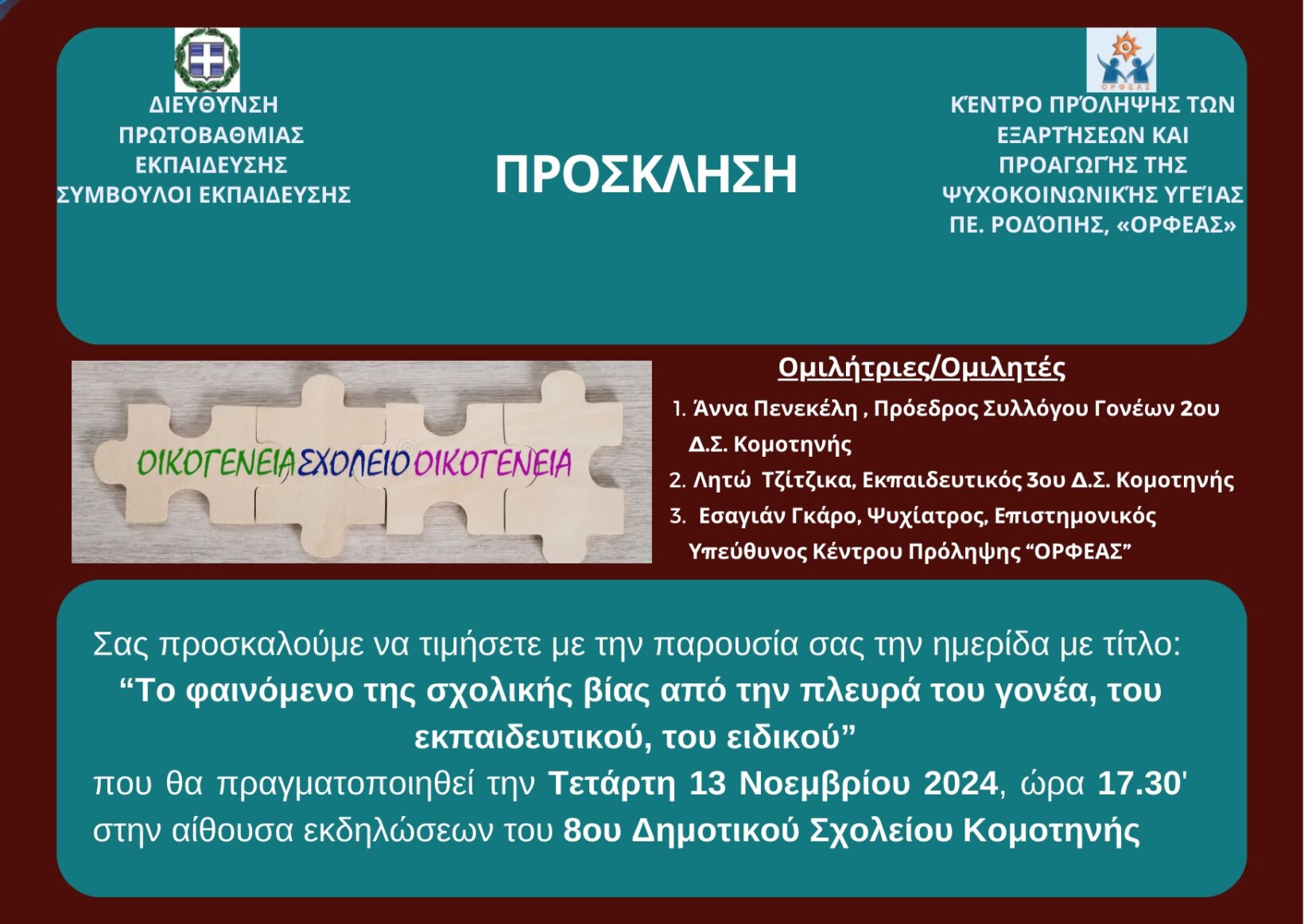 Οι Σύμβουλοι Εκπαίδευσης (ΣΕ) της Διεύθυνσης Πρωτοβάθμιας Εκπαίδευσης Ροδόπης: Άννα Αφεντουλίδου (ΠΕ70), Αχμέτ Νιζάμ (ΠΕ73), Νικόλαος Τσουρής (ΠΕ70) και Σουλτάνα Τσιγγίδου (ΠΕ60) σε συνεργασία με το Κέντρο Πρόληψης των Εξαρτήσεων και Προαγωγής της Ψυχοκοινωνικής Υγείας ΠΕ. Ροδόπης, «ΟΡΦΕΑΣ» διοργανώνουν ενημερωτική ημερίδα για γονείς την Τετάρτη 13 Νοεμβρίου 2024 στην αίθουσα εκδηλώσεων του 8ου Δ.Σ. Κομοτηνής με τίτλο: «Το φαινόμενο της σχολικής βίας από την πλευρά του γονέα, της εκπαιδευτικού, του ειδικού».