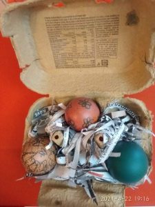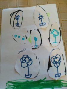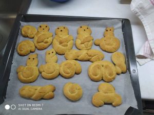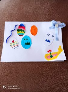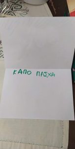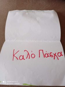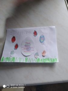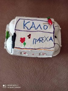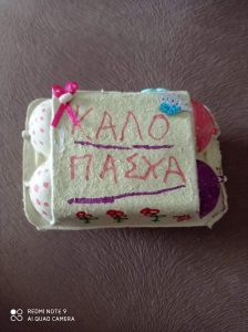 Έτσι κάναμε όλες τις απαραίτητες προετοιμασίες σαν να ήμαστε στο σχολείο μας : και τις πασχαλινές μας κάρτες φτιάξαμε….και τις αυγοθήκες μας ετοιμάσαμε…και τα αυγά μας βάψαμε….και τα λαζαράκια μας ζυμώσαμε….και τα πασχαλινά μας κουλουράκια ψήσαμε και μοσχοβόλησαν τα σπίτια μας!!!