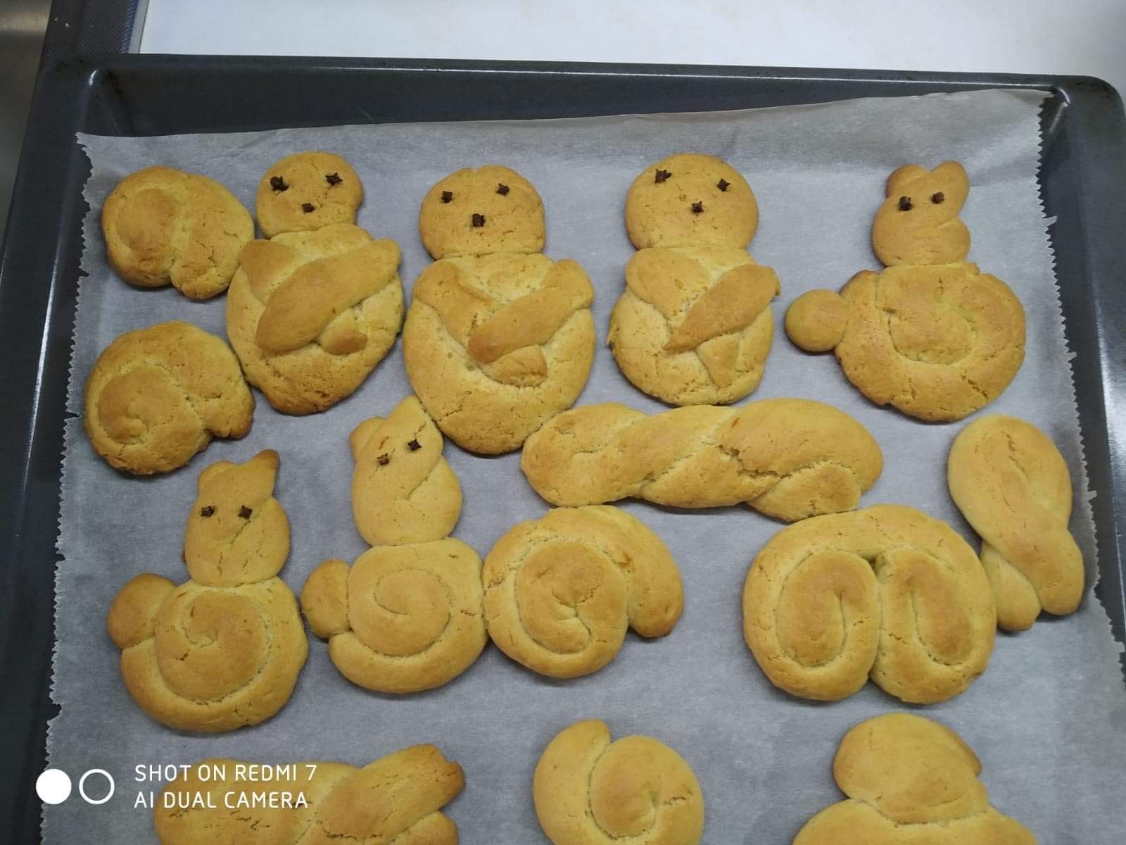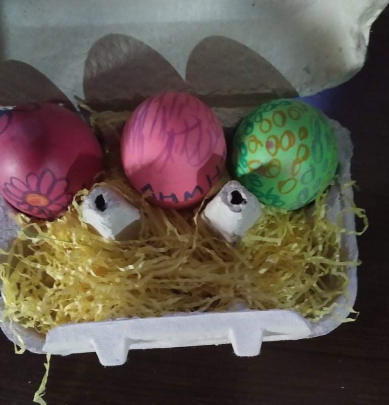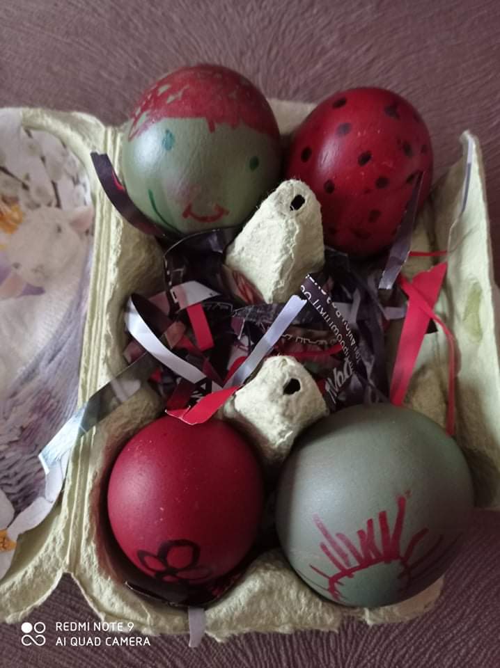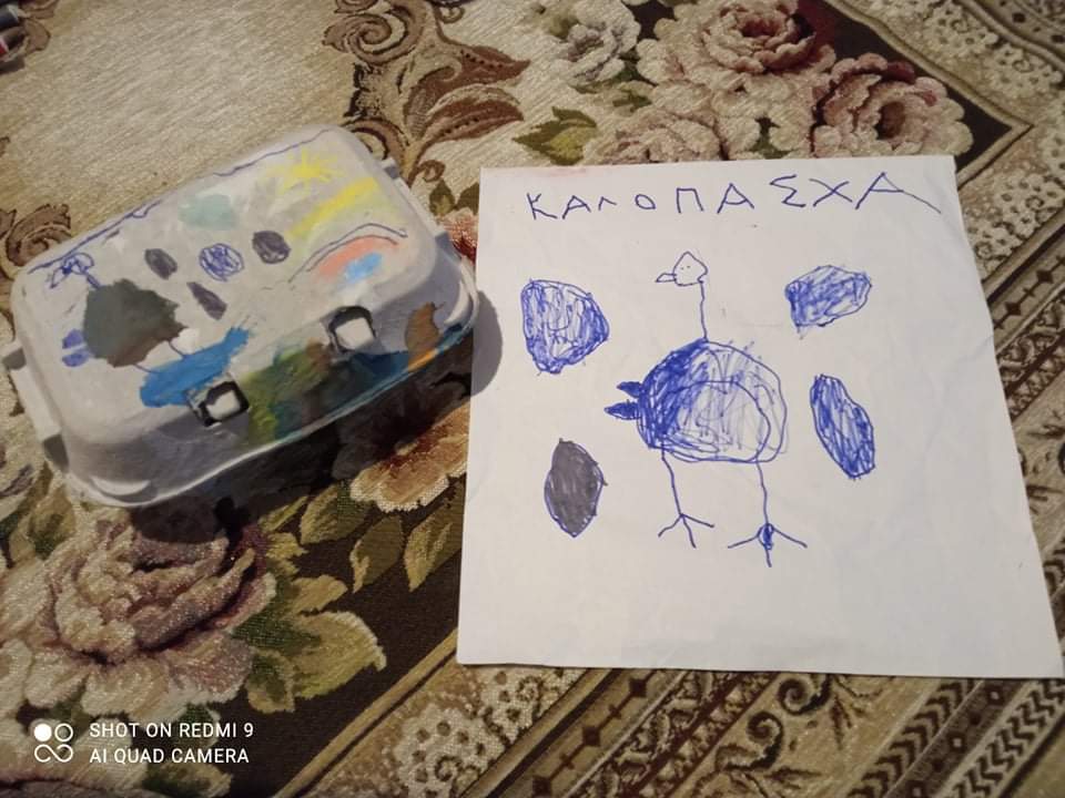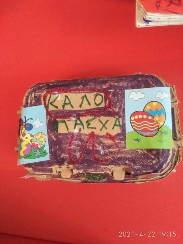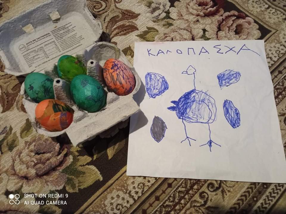 Έτσι κάναμε όλες τις απαραίτητες προετοιμασίες σαν να ήμαστε στο σχολείο μας : και τις πασχαλινές μας κάρτες φτιάξαμε….και τις αυγοθήκες μας ετοιμάσαμε…και τα αυγά μας βάψαμε….και τα λαζαράκια μας ζυμώσαμε….και τα πασχαλινά μας κουλουράκια ψήσαμε και μοσχοβόλησαν τα σπίτια μας!!!