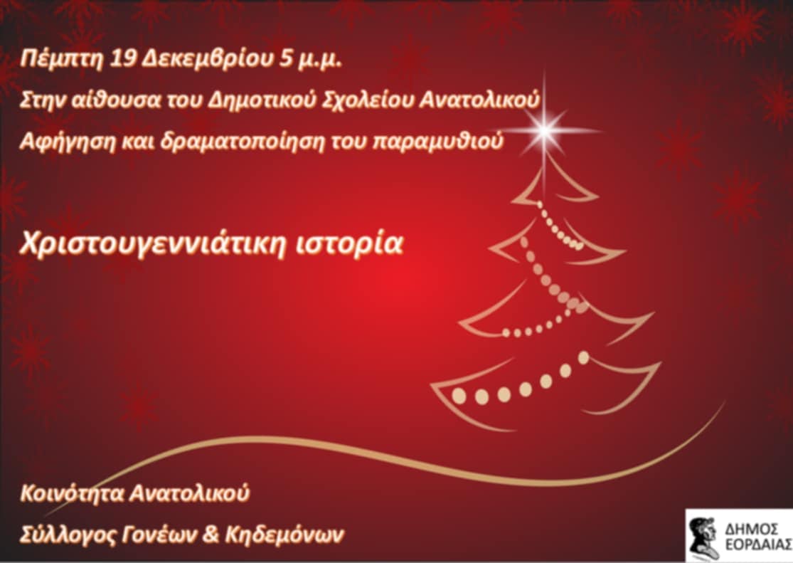 Σήμερα το απόγευμα, το σχολείο μας, σε συνεργασία με την κοινότητα Ανατολικού και τον σύλλογο Γονέων και Κηδεμόνων, φιλοξένησε μια λαμπρή χριστουγεννιάτικη εκδήλωση. Οι μαθητές μας συμμετείχαν σε ένα πλούσιο καλλιτεχνικό πρόγραμμα με χορούς, τραγούδια και δραματοποίηση της γνωστής σε όλους μας «Χριστουγεννιάτικης Ιστορίας».