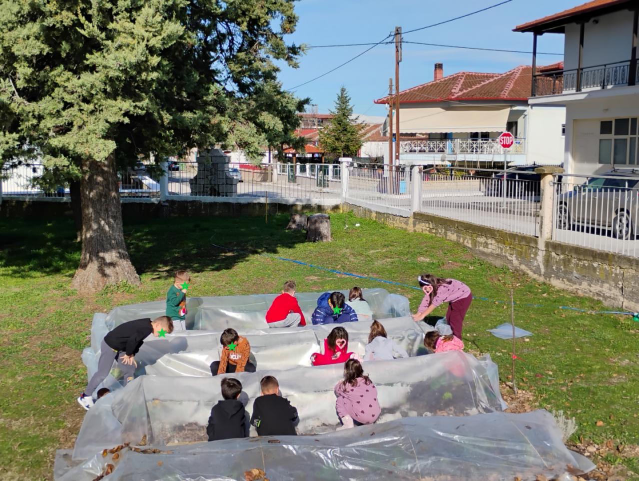 Με τη βοήθεια των εκπαιδευτικών, οι μαθητές τοποθέτησαν νάιλον πάνω από τα παρτέρια, δημιουργώντας ένα μικρό θερμοκήπιο που τα προστατεύει από τον παγετό και βοηθά τη σωστή ανάπτυξή τους.