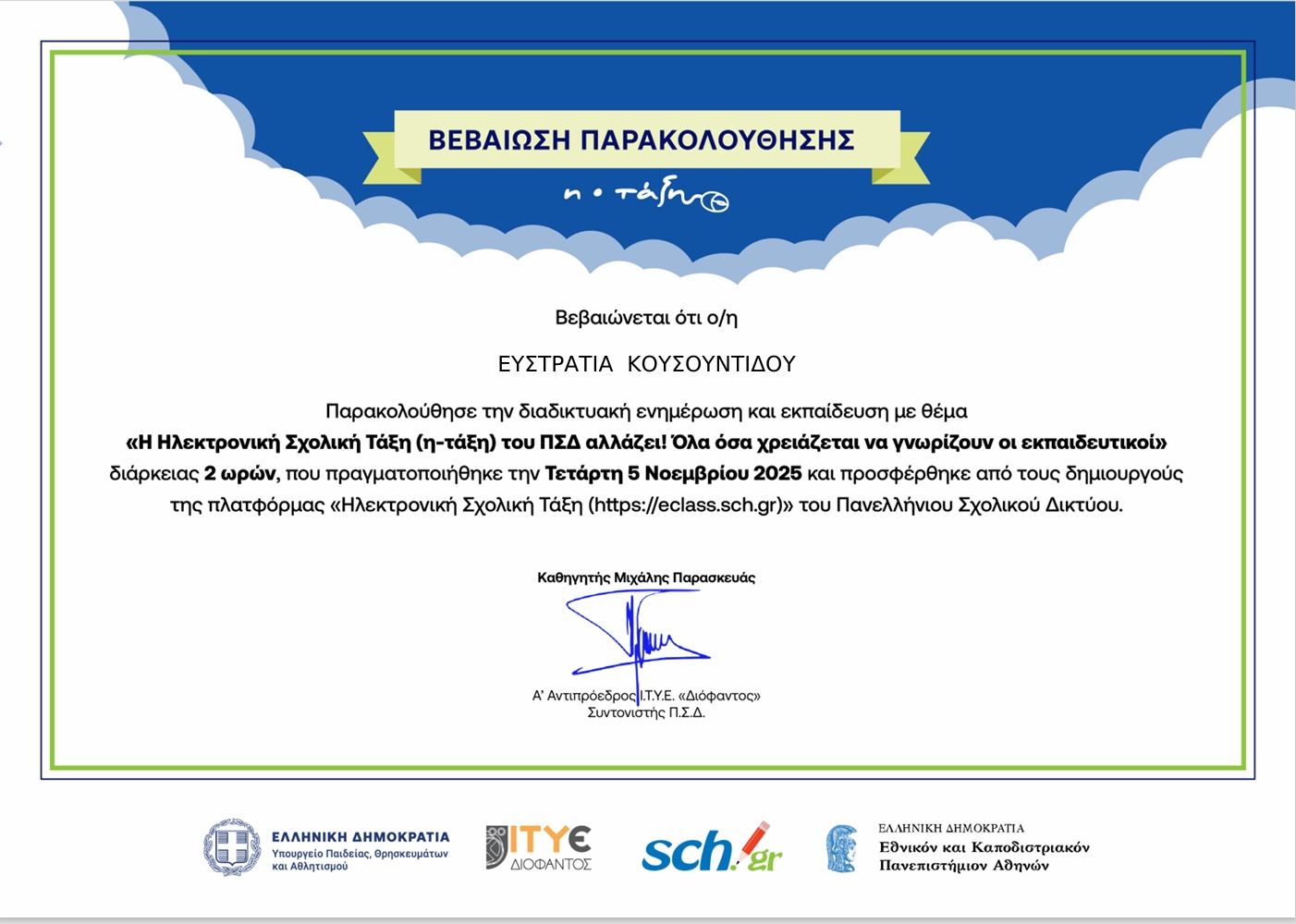 - Επιμορφωτικό Πρόγραμμα (επτάωρη σύγχρονη εξ αποστάσεως εκπαίδευση) πραγματοποιήθηκε την Πέμπτη, 27 Μαρτίου 2025(8.30-15.30).