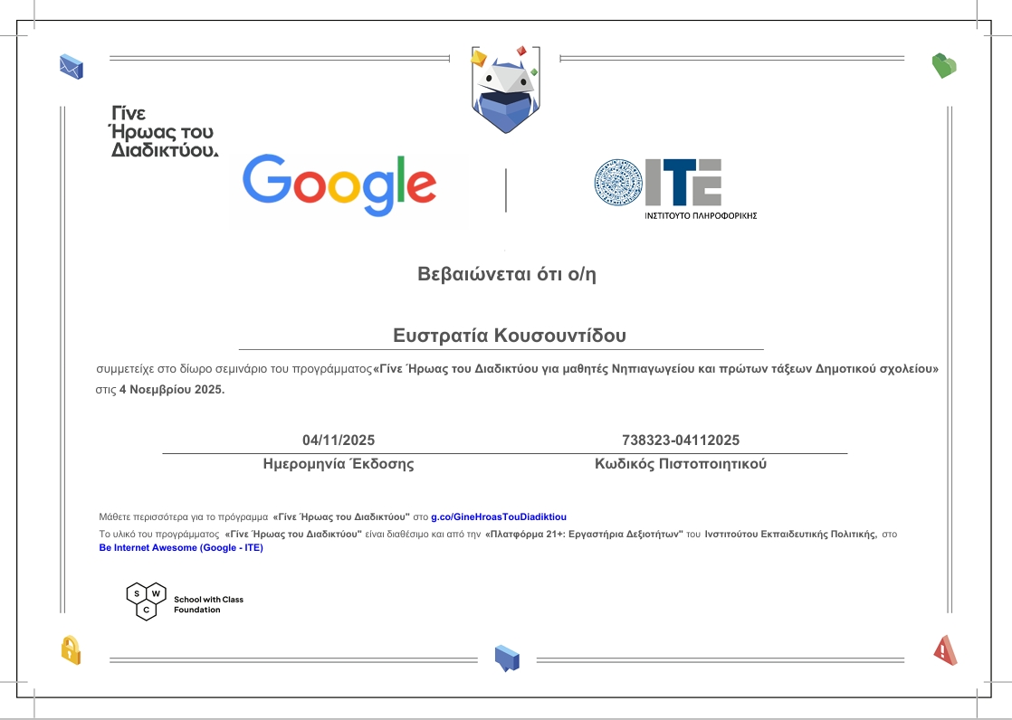 - O κύκλος μαθημάτων “Γίνε Ήρωας του Διαδικτύου (μικρότερα παιδιά)“ που απευθύνεται σε εκπαιδευτικούς Νηπιαγωγείου και πρώτων τάξεων του Δημοτικού (ηλικίες 5-9) – ένα δίωρο σεμινάριο.