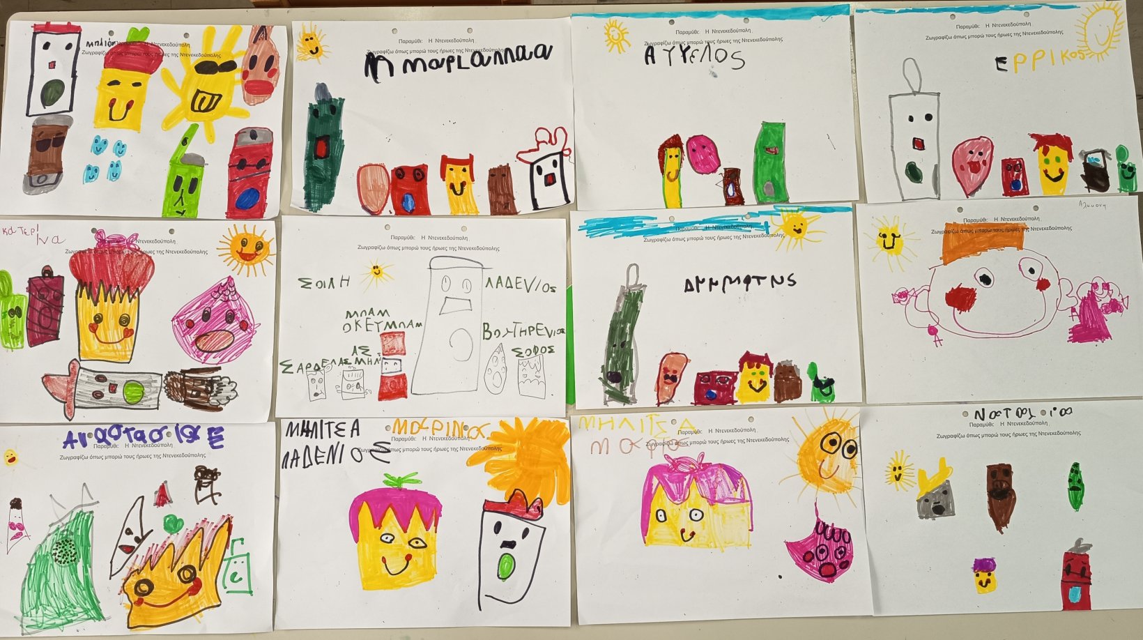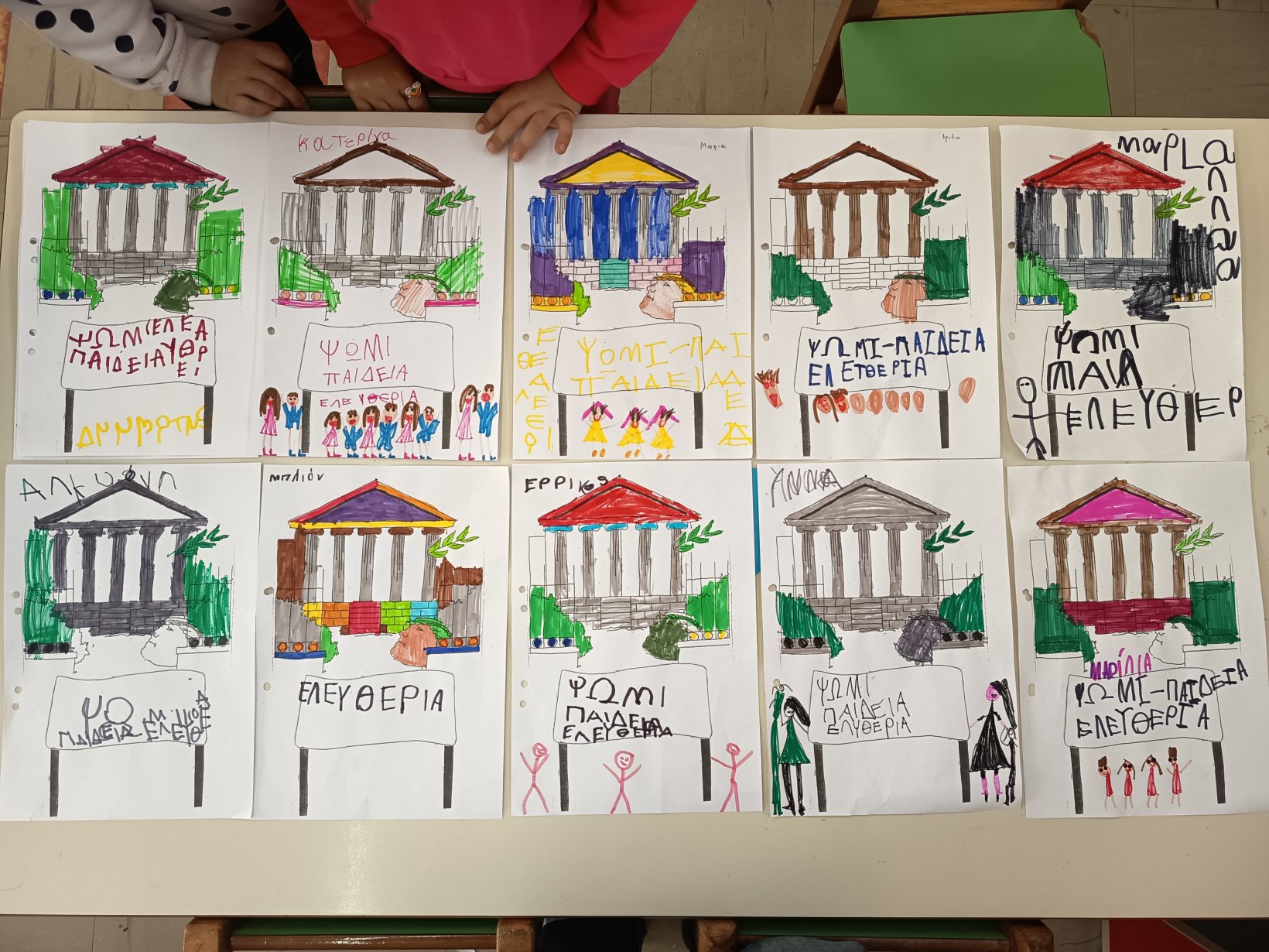 Τα παιδιά ζωγράφισαν την Ντενεκεδούπολη , από το πολύ ωραίο παραμύθι της Ευγενίας Φακίνου και αφού ακούσαμε το χρονικό του Πολυτεχνείου, τα παιδιά ζωγράφισαν και έγραψαν συνθήματα