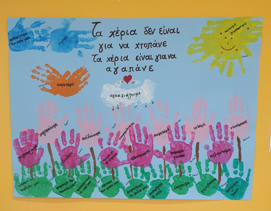 Μεγάλη σημασία δώσαμε όμως και στα χέρια που τα έχουμε για να αγκαλιάζουμε και όχι για να πληγώνουμε. Τα παιδιά εκτός από την αγκαλιά είπαν και άλλες πολύ όμορφες ιδέες. Όλες μαζί τις μάζεψαν και τις έκαναν αφίσα για την τάξη τους.