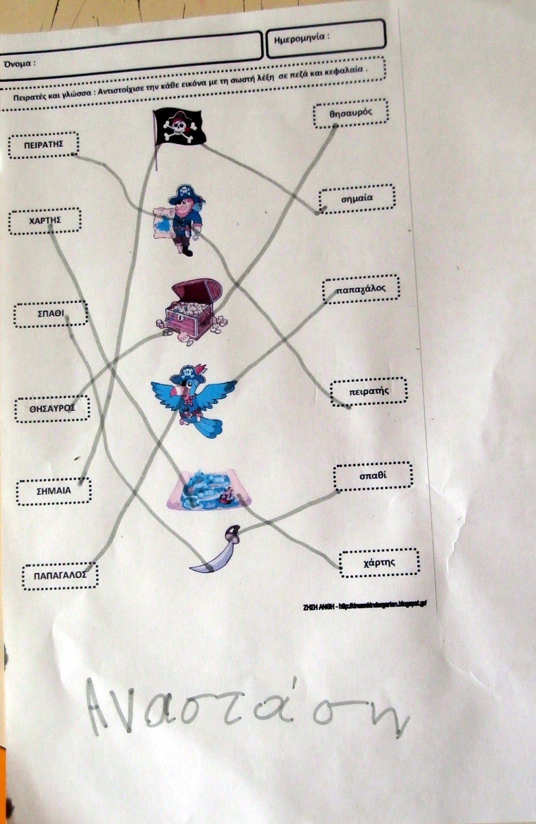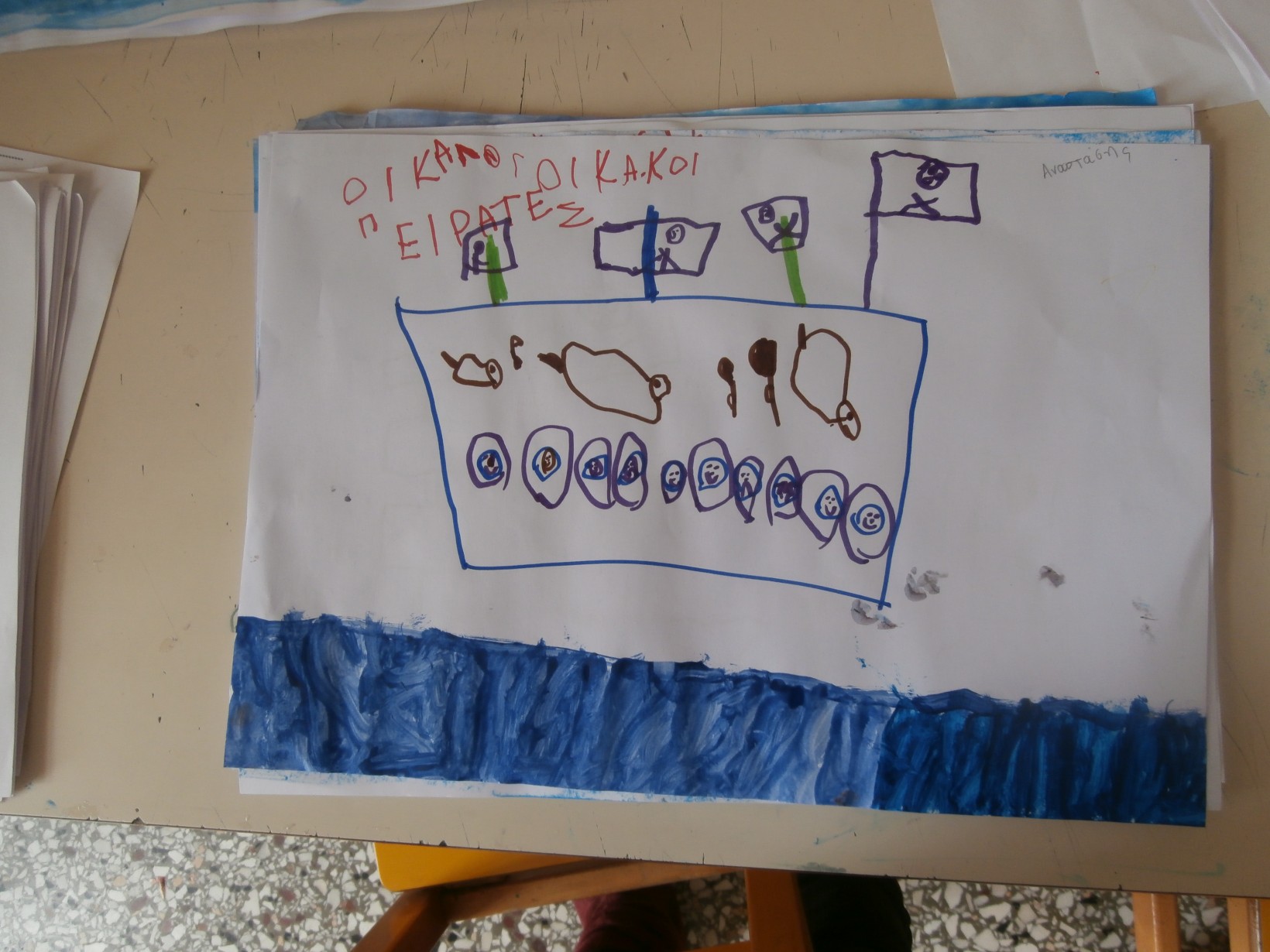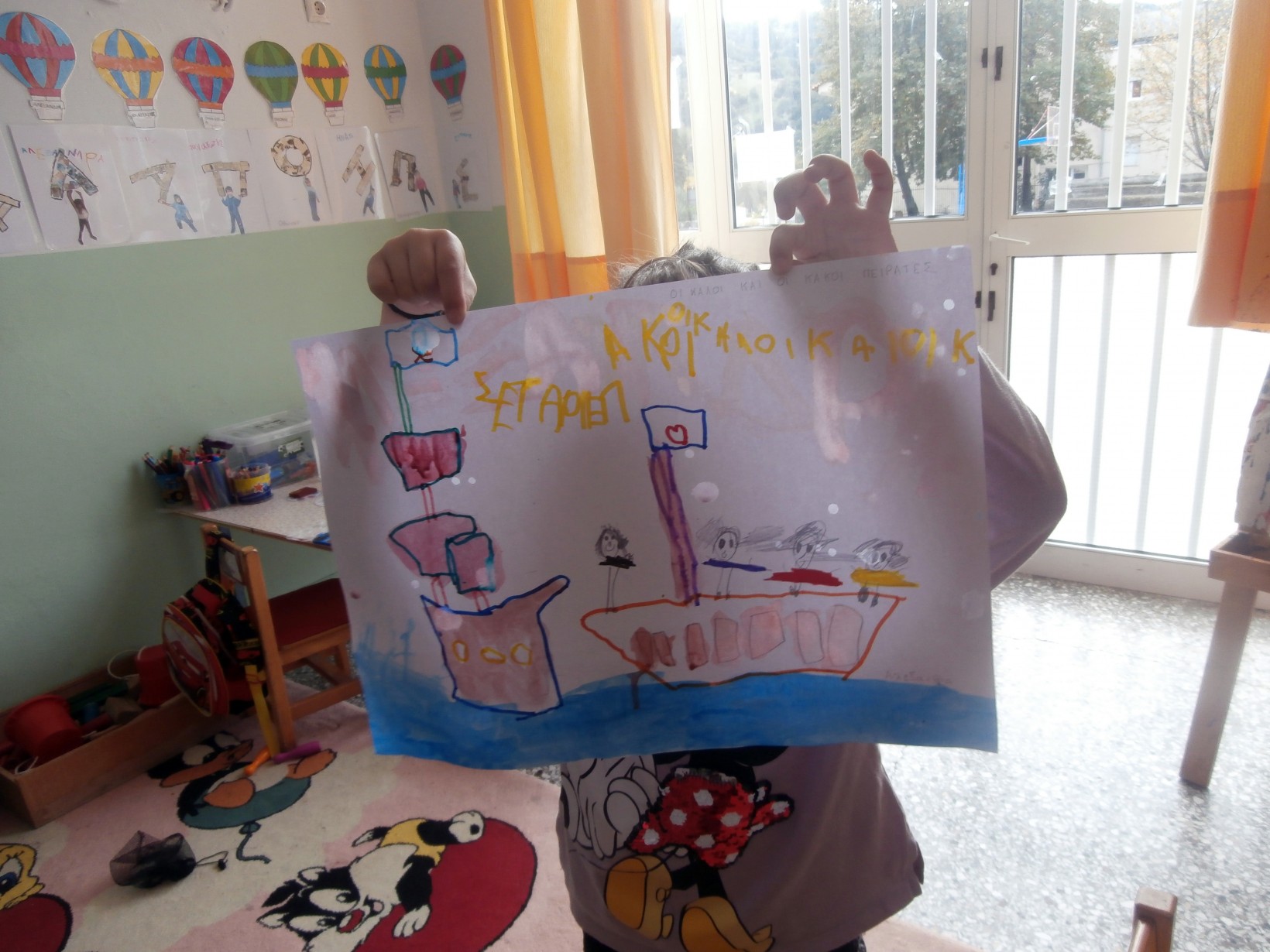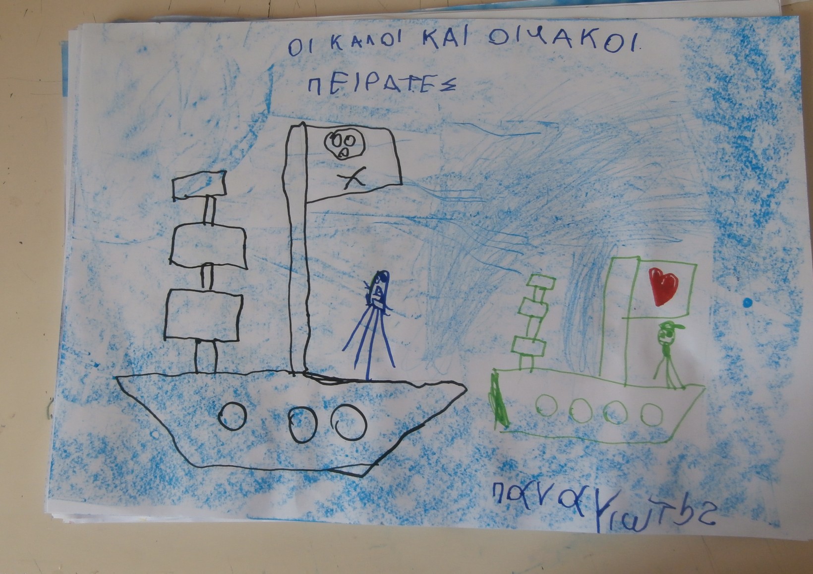 Ασχοληθήκαμε με την αφήγηση του παραμυθιού του Αντώνη Θεοδουλίδη με τίτλο ..οι καλοί κι οι κακοί πειρατές. Γελάσαμε πολύ, ζωγραφίσαμε ότι μας άρεσε από το παραμύθι και γράψαμε όπως μπορούμε τον τίτλο του παραμυθιού . Ακολούθησε δραματοποίηση της ιστορίας από τα παιδιά.