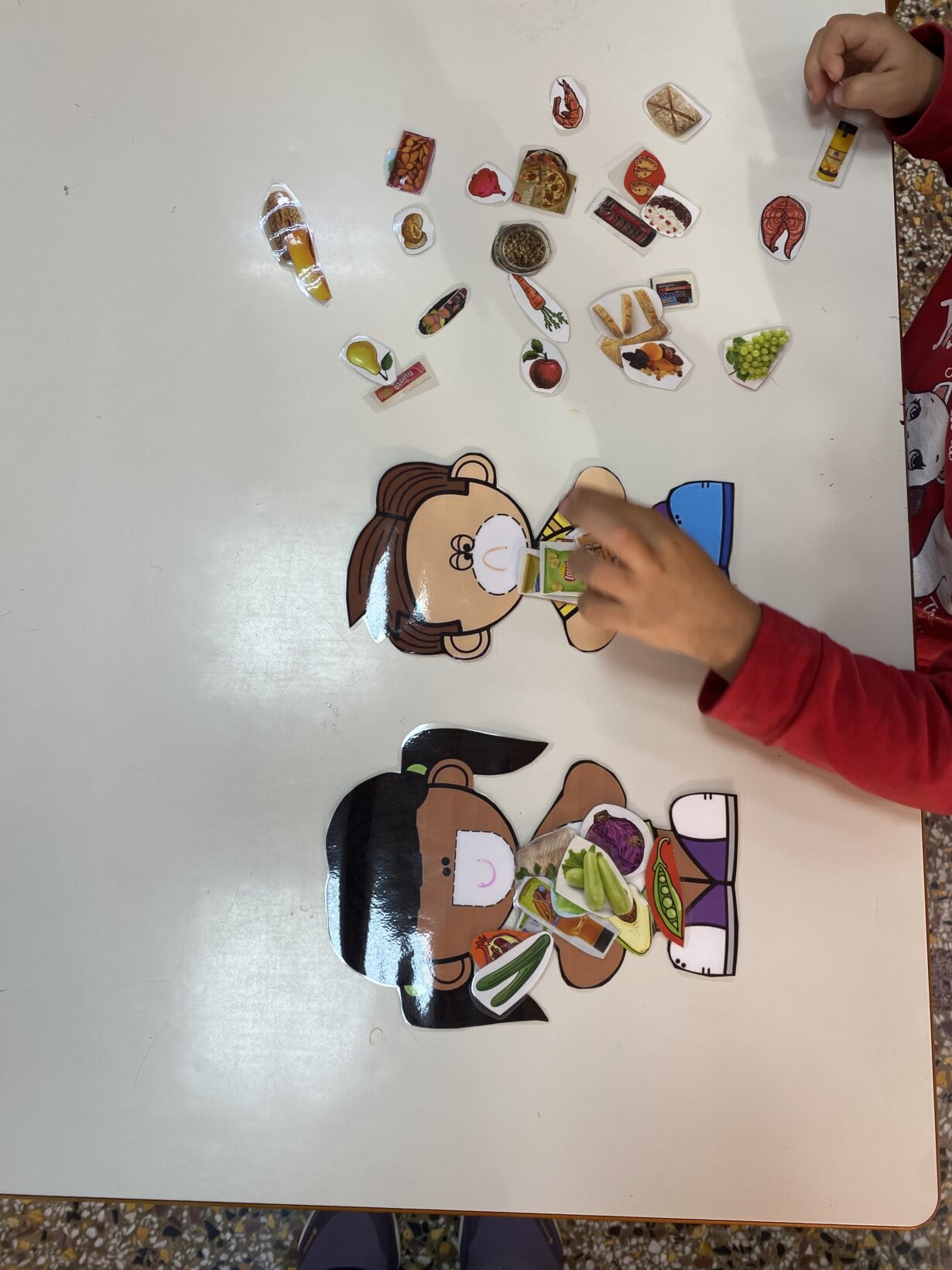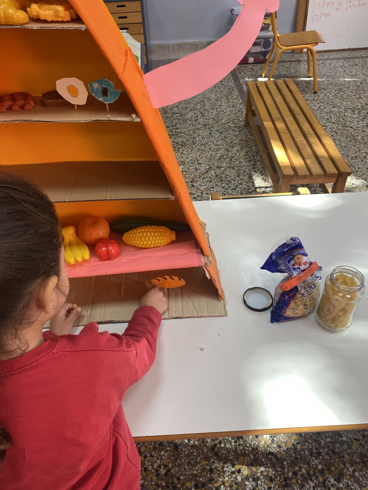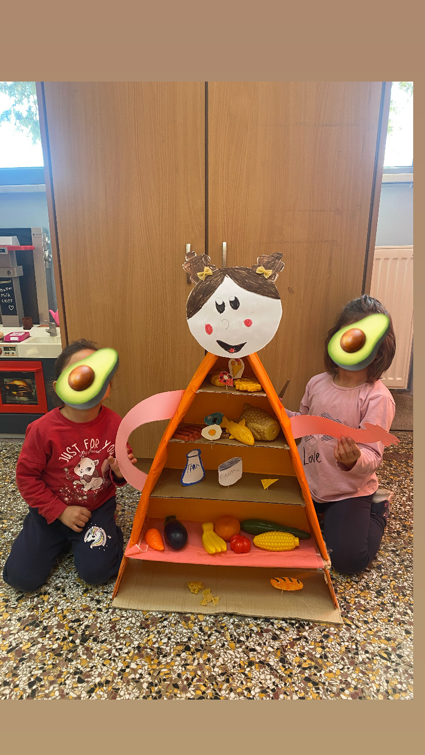 Στο πρώτο εργαστήριο δεξιοτήτων κατά τους μήνες Οκτώβριο και Νοέμβριο ασχοληθήκαμε με τη θεματική της υγιεινής διατροφής. Αναφέραμε τα αγαπημένα μας φαγητά, τα κατηγοριοποιήσαμε σε ομάδες ανάλογα με τη διατροφική τους αξία και δημιουργήσαμε τη δική μας πυραμίδα της μεσογειακής διατροφής στην τάξη μας.
