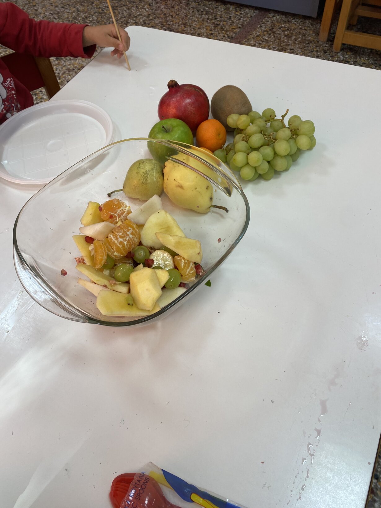 Αποφασίσαμε να κανονίσουμε μία μέρα το πρωινό μας να αποτελείται αποκλειστικά από φρούτα. Συγκεντρώσαμε λοιπόν φρούτα εποχής, τα δοκιμάσαμε και αφού τα απολαύσαμε φτιάξαμε φρουτοζωάκια με αυτά