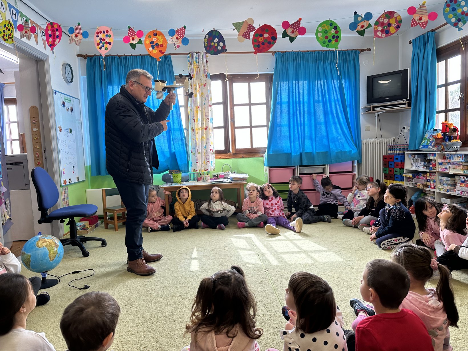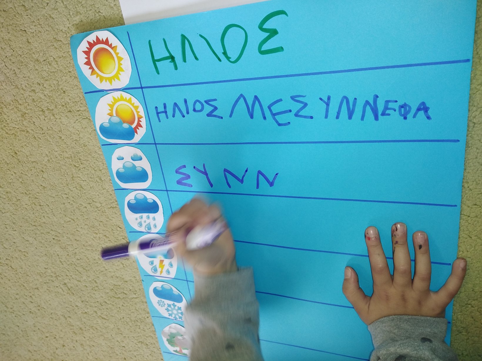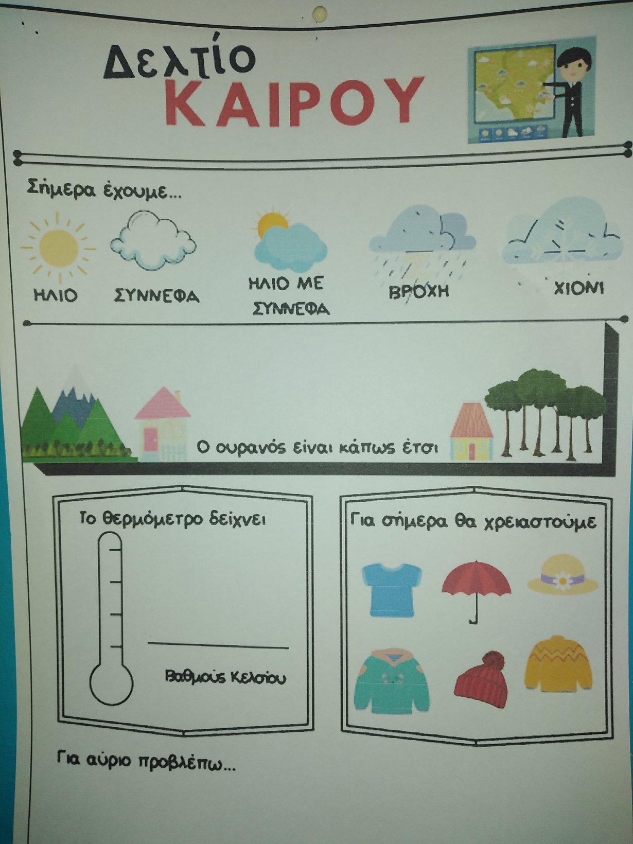 Ένα ακόμη εργαστήριο δεξιοτήτων ολοκληρώθηκε με μεγάλη επιτυχία στο νηπιαγωγείο μας. Το τελευταίο χρονικό διάστημα, καταγράφαμε καθημερινά τον καιρό της ημέρας, κάναμε προγνώσεις, παρουσιάσαμε δελτία καιρού,  μάθαμε να χρησιμοποιούμε το θερμόμετρο και να μιλάμε για χαμηλές και υψηλές θερμοκρασίες, φτιάξαμε τα δικά μας εργαλεία μέτρησης, αναζητούσαμε πληροφορίες για τα καιρικά φαινόμενα, καλέσαμε ειδικούς, κάναμε αμέτρητα πειράματα … Με λίγα λόγια, γίναμε μικροί μετεωρολόγοι! Σας παρουσιάζουμε, λοιπόν, ενδεικτικά κάποιες φωτογραφίες από τις δράσεις μας!