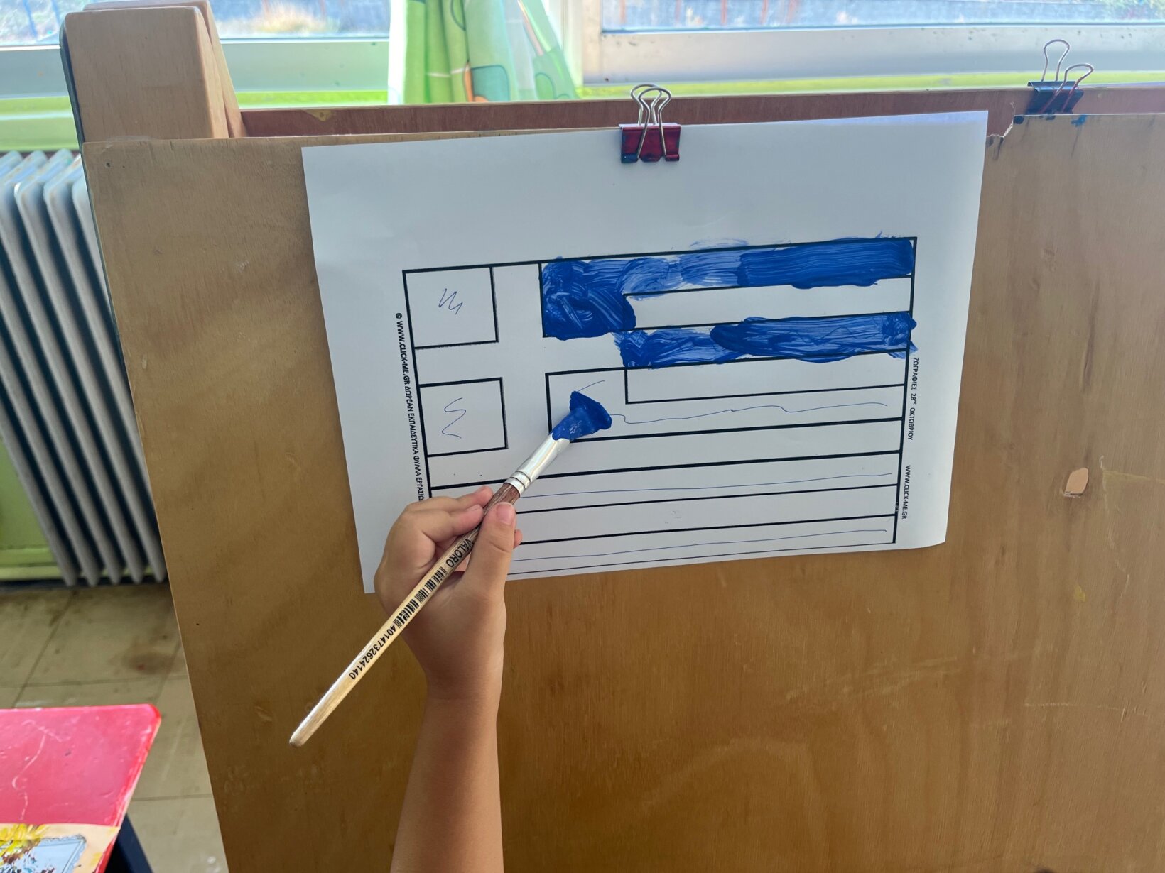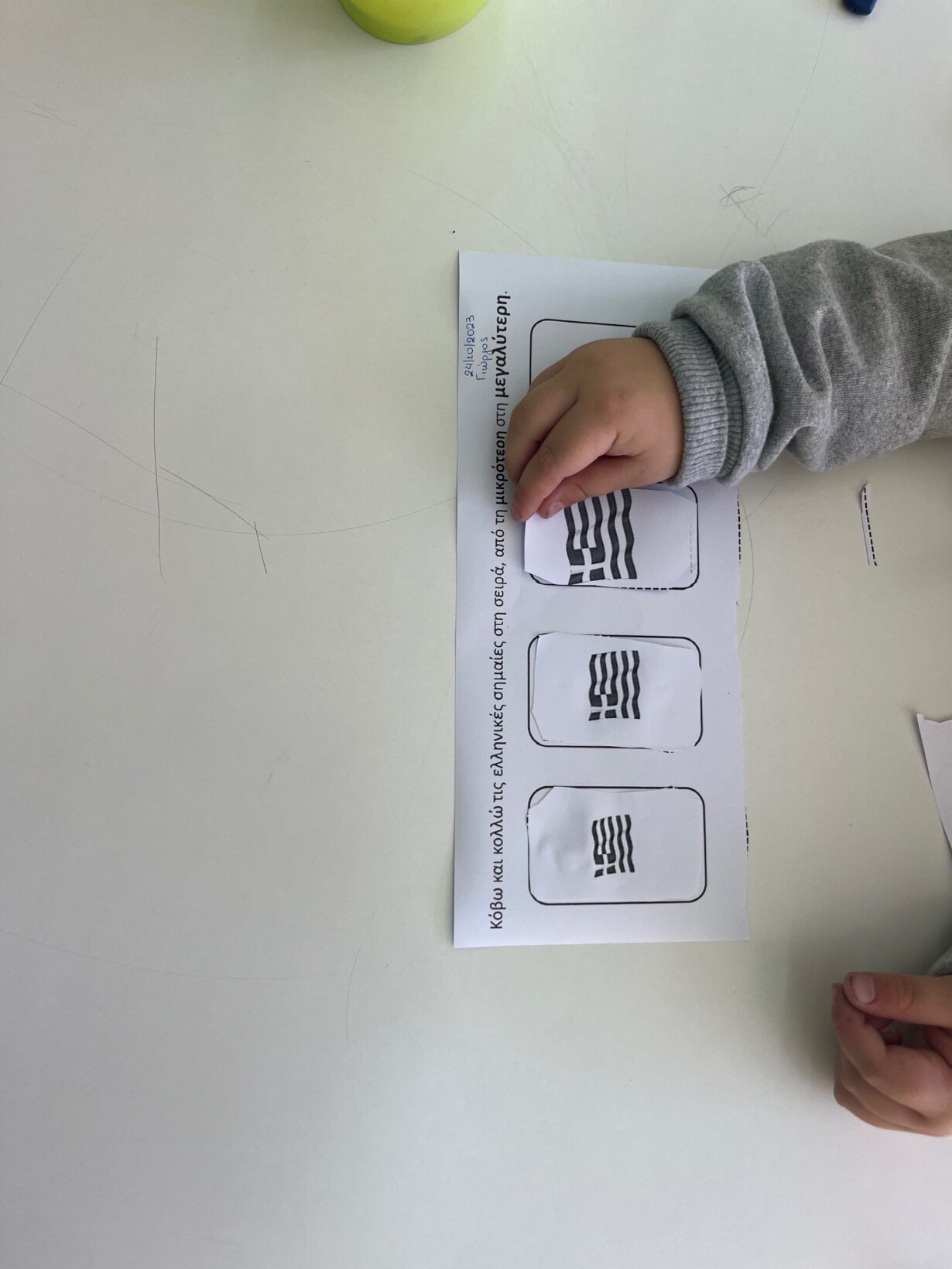 Ζωγραφίσαμε την ελληνική σημαία και μάθαμε έννοιες όπως μεγάλο και μικρό. Κόψαμε και κολλήσαμε τις ελληνικές σημαίες ξεκινώντας από τη μικρότερη και ακολουθώντας την πορεία έως τη μεγαλύτερη…
