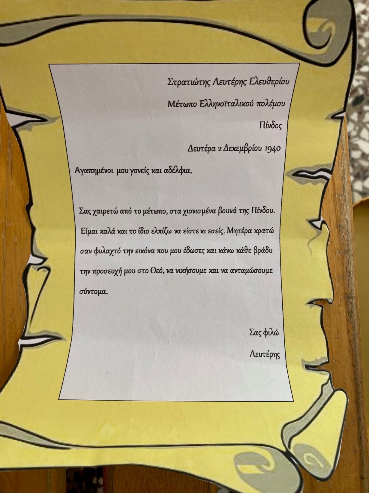 Το πρώτο πράγμα που αντικρίσαμε ήταν ένα γράμμα του Λευτέρη που πολεμούσε για τη λευτεριά της πατρίδας μας, στα βουνά της Πίνδου. Το έστελνε στην οικογένειά του και τους εξηγούσε ότι ήταν καλά και ότι περίμενε πότε θα νικήσει για να επιστρέψει και να τους ανταμώσει. Έγραφε πως προσευχόταν κάθε βράδυ στην εικόνα που του είχε δώσει η μητέρα του…Την κρατούσε σαν φυλαχτό!
