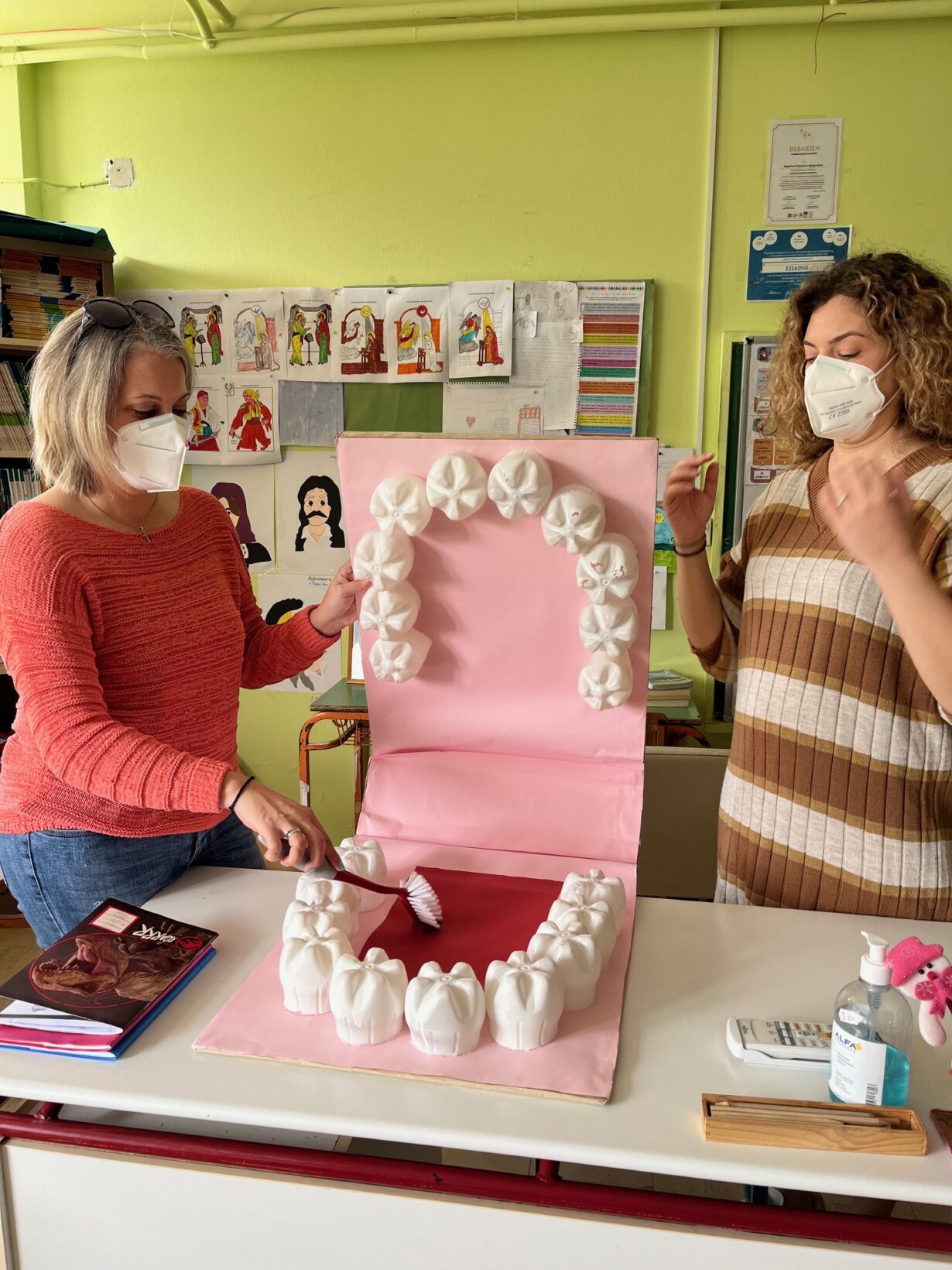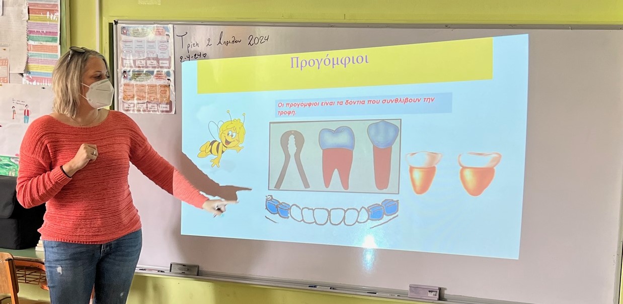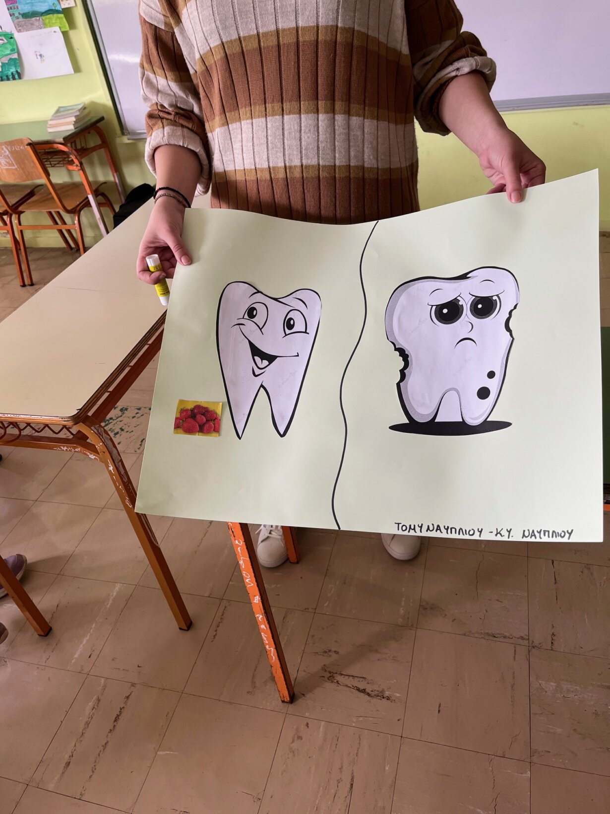 Αφού γνωριστήκαμε με τις επισκέπτριες υγείας κ. Βαρδάκα Φωτεινή και κ. Στρούμπου Ευφροσύνη, είδαμε από πιο κοντά το μαγικό κόσμο των δοντιών που χρειάζεται να προστατεύουμε για όλη μας τη ζωή. Μάθαμε τις ονομασίες και που χρησιμεύει η κάθε ομάδα δοντιών, παρατηρήσαμε και συγκρίναμε τα νεογιλά δόντια με αυτά που έχουμε μετέπειτα ως ενήλικες ως προς τον αριθμό και τις μεταβολές τους, γνωρίσαμε τους κύριους διατροφικούς εχθρούς των δοντιών και μάθαμε τρόπους να τους απωθούμε ώστε να μην μας καταστρέφουν τα μόνιμα δόντια μας, κατανοήσαμε την αναγκαιότητα της επίσκεψης στον οδοντίατρο 2 φορές τον χρόνο κ.α.