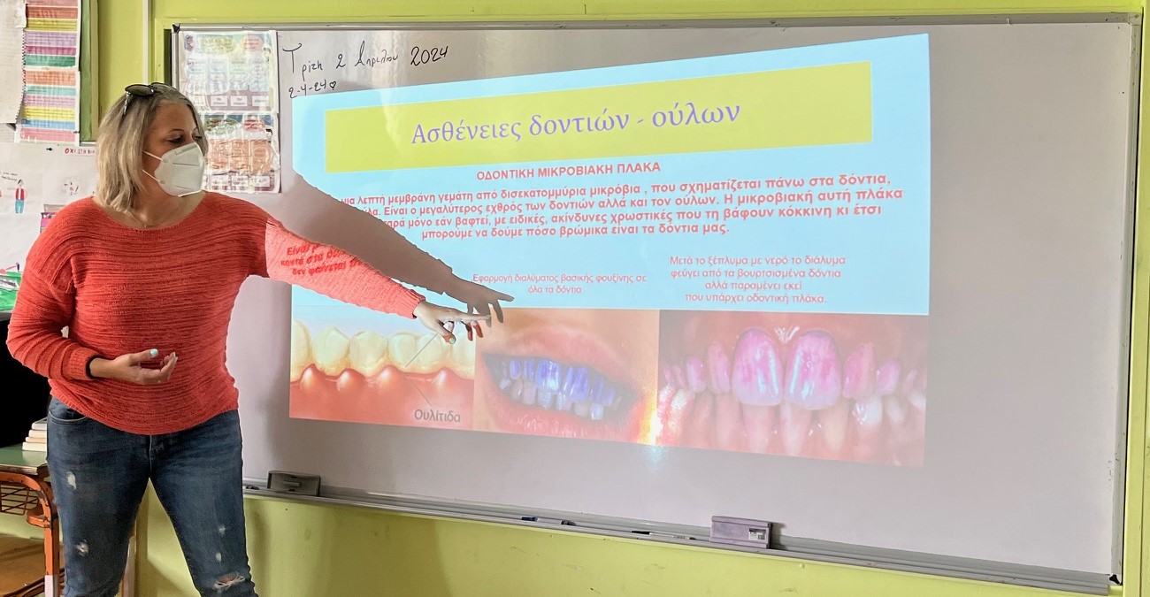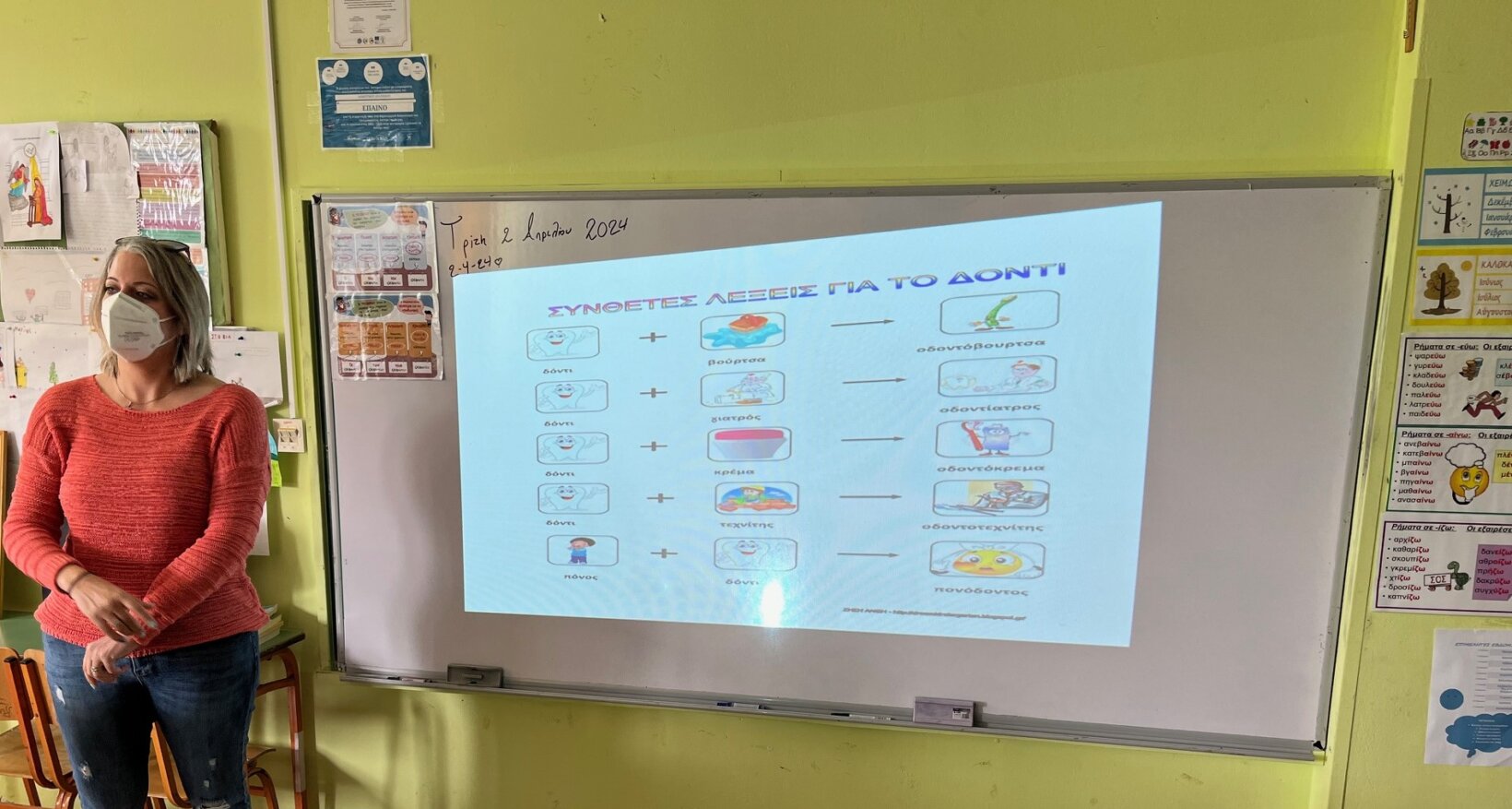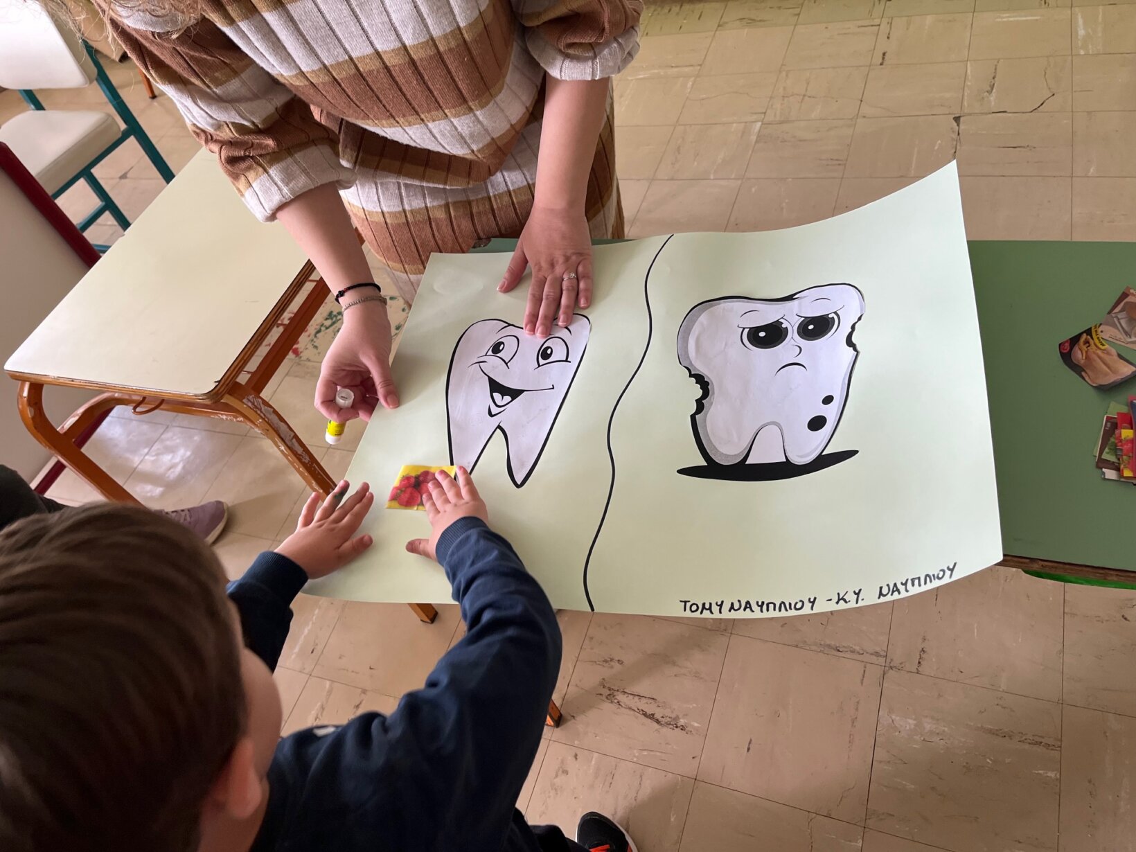 Αφού γνωριστήκαμε με τις επισκέπτριες υγείας κ. Βαρδάκα Φωτεινή και κ. Στρούμπου Ευφροσύνη, είδαμε από πιο κοντά το μαγικό κόσμο των δοντιών που χρειάζεται να προστατεύουμε για όλη μας τη ζωή. Μάθαμε τις ονομασίες και που χρησιμεύει η κάθε ομάδα δοντιών, παρατηρήσαμε και συγκρίναμε τα νεογιλά δόντια με αυτά που έχουμε μετέπειτα ως ενήλικες ως προς τον αριθμό και τις μεταβολές τους, γνωρίσαμε τους κύριους διατροφικούς εχθρούς των δοντιών και μάθαμε τρόπους να τους απωθούμε ώστε να μην μας καταστρέφουν τα μόνιμα δόντια μας, κατανοήσαμε την αναγκαιότητα της επίσκεψης στον οδοντίατρο 2 φορές τον χρόνο κ.α.