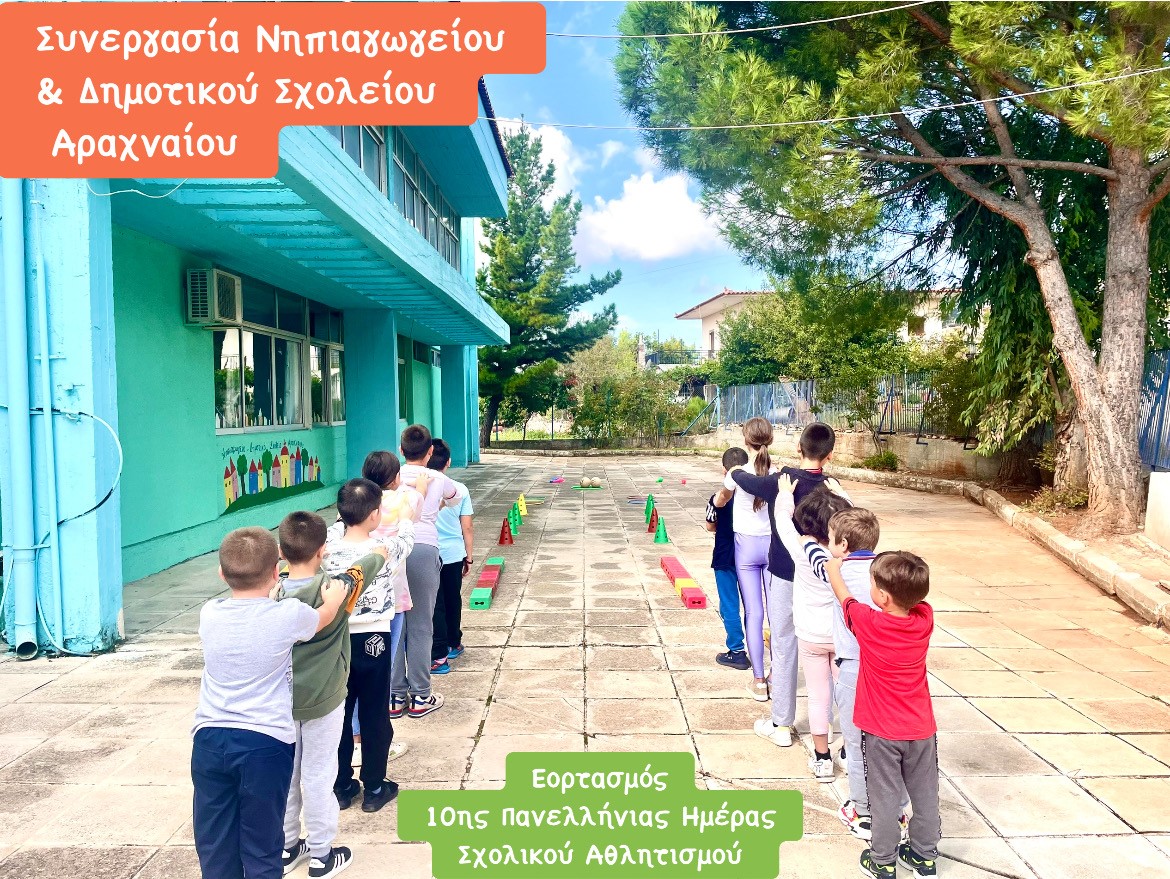 Την Παρασκευή 29 Σεπτεμβρίου 2023, εορτάστηκε η 10η Πανελλήνια Ημέρα Σχολικού Αθλητισμού, στα πλαίσια της εναρμόνισής της με την Ευρωπαϊκή Ημέρα Σχολικού Αθλητισμού. Το Νηπιαγωγείο Αραχναίου και οι μαθητές του “ένωσαν τα χέρια” με το συστεγαζόμενο Δημοτικό Σχολείο και συμμετείχαν ενεργά στις αθλητικές δράσεις που διοργανώθηκαν από τους εκπαιδευτικούς και των δύο σχολείων. Οι αθλητικές δραστηριότητες που αναπτύχθηκαν ήταν σκυταλοδρομίες, αγώνες ταχύτητας και άλματα, στον προαύλιο χώρο, έχοντας ως κύριο στόχο να κατανοήσουν τα οφέλη του αθλητισμού και ευρύτερα της σωματικής άσκησης. Η φυσική δραστηριότητα από την αρχαιότητα έχει αναδειχθεί ως βασική προϋπόθεση για την προαγωγή της υγείας και ευεξίας από το γνωμικό “Νους υγιής εν σώματι υγιεί”. Έτσι και οι μαθητές των δύο βαθμίδων έδωσαν το δικό τους μήνυμα, που είναι κοινό για όλη τη μαθητική κοινότητα