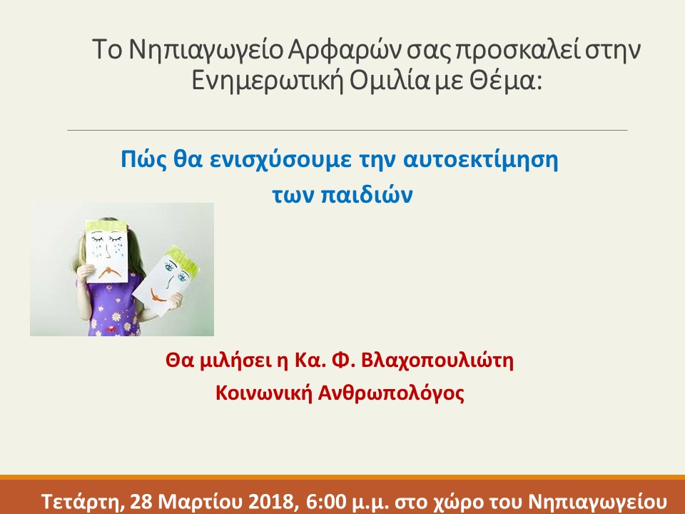 Το νηπιαγωγείο μας πραγματοποιεί Ενημερωτική Ομιλία με θέμα: «Πως θα ενισχύσουμε την αυτοεκτίμηση των παιδιών». Σας περιμένουμε όλους την Τετάρτη , 28 Μαρτίου 2018 και ώρα 18:ο0 μ.μ. στο χώρο του Νηπιαγωγείου.
