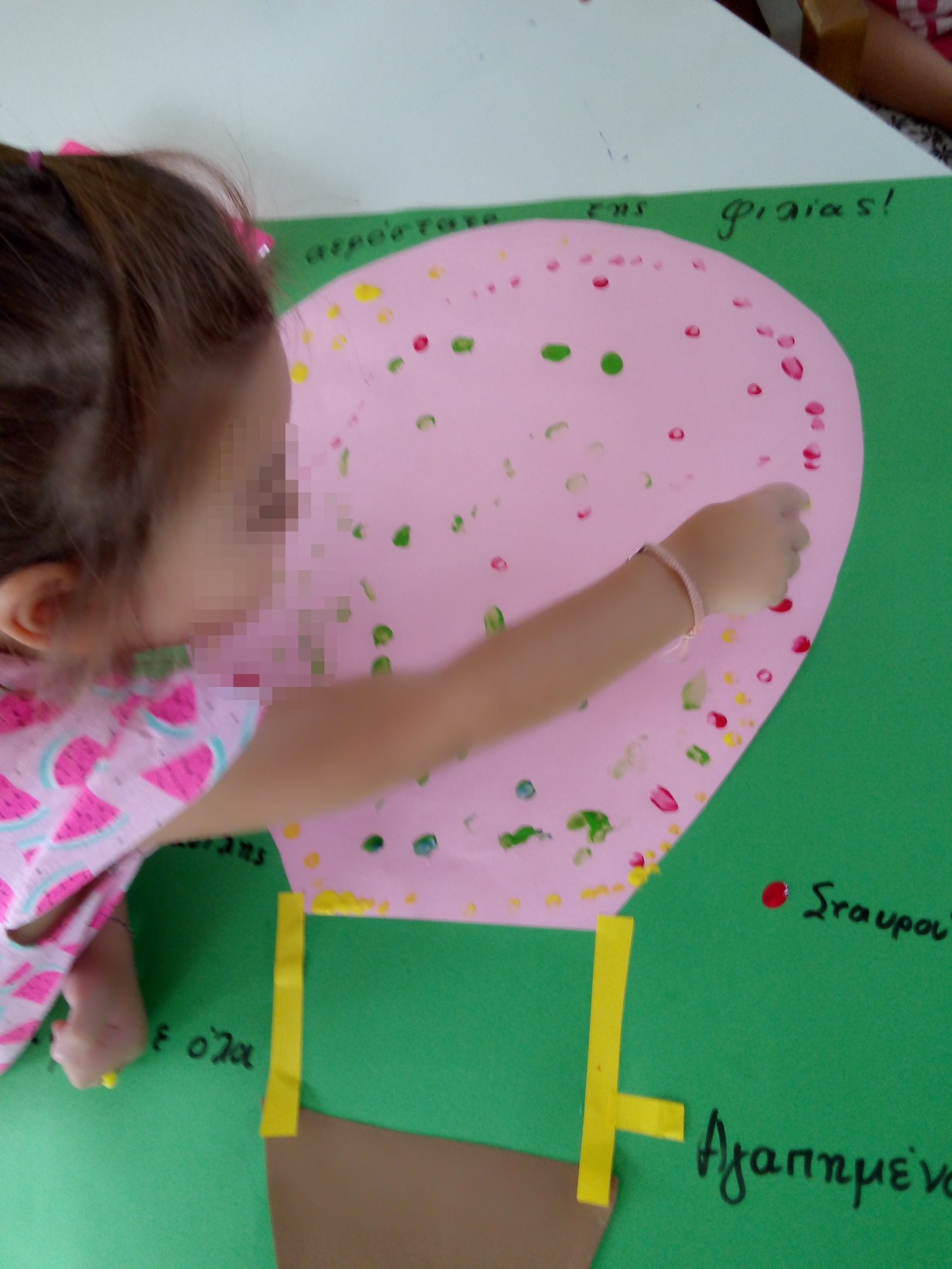 Αφού συζητήσαμε, για την αξία της ομάδας και της φιλίας αποφασίσαμε να φτιάξουμε ένα αερόστατο που το ονομάσαμε το αερόστατο της φιλίας. Κάθε παιδί επέλεξε ένα χρώμα και αφού μας έλεγε ποιό είναι και τι του θυμίζει (πχ κίτρινο σαν το λεμόνι) άφηνε τύπωματα με το δάχτυλο του επάνω στο μπαλόνι. Στο τέλος θαύμασαν το αποτέλεσμα και συνειδητοποίησαν ότι το μπαλόνι έγινε πολύχρωμο και όμορφο χάρη στη βοήθεια ΟΛΩΝ!
