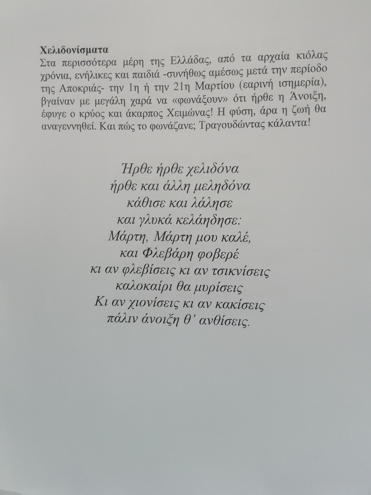 Τα Χελιδονίσματα είναι ένα έθιμο της πρώτης μέρας του Μαρτίου που μας έρχεται από τα αρχαία χρόνια. Σύμφωνα με αυτό,  τα παιδιά κρατώντας ένα ξύλινο ομοίωμα χελιδονιού τραγουδούν και  καλωσορίζουν την Άνοιξη. Περισσότερες πληροφορίες για τα χελιδονίσματα στον παρακάτω σύνδεσμο: Χελιδονίσματα – Βικιπαίδεια (wikipedia.org)