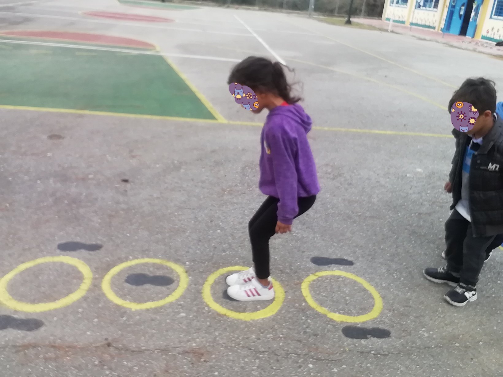 Ένα ένα παιδάκι λέει το όνομα του και πηδάει μέσα στο στεφάνι μια φορά και μετά μια έξω.