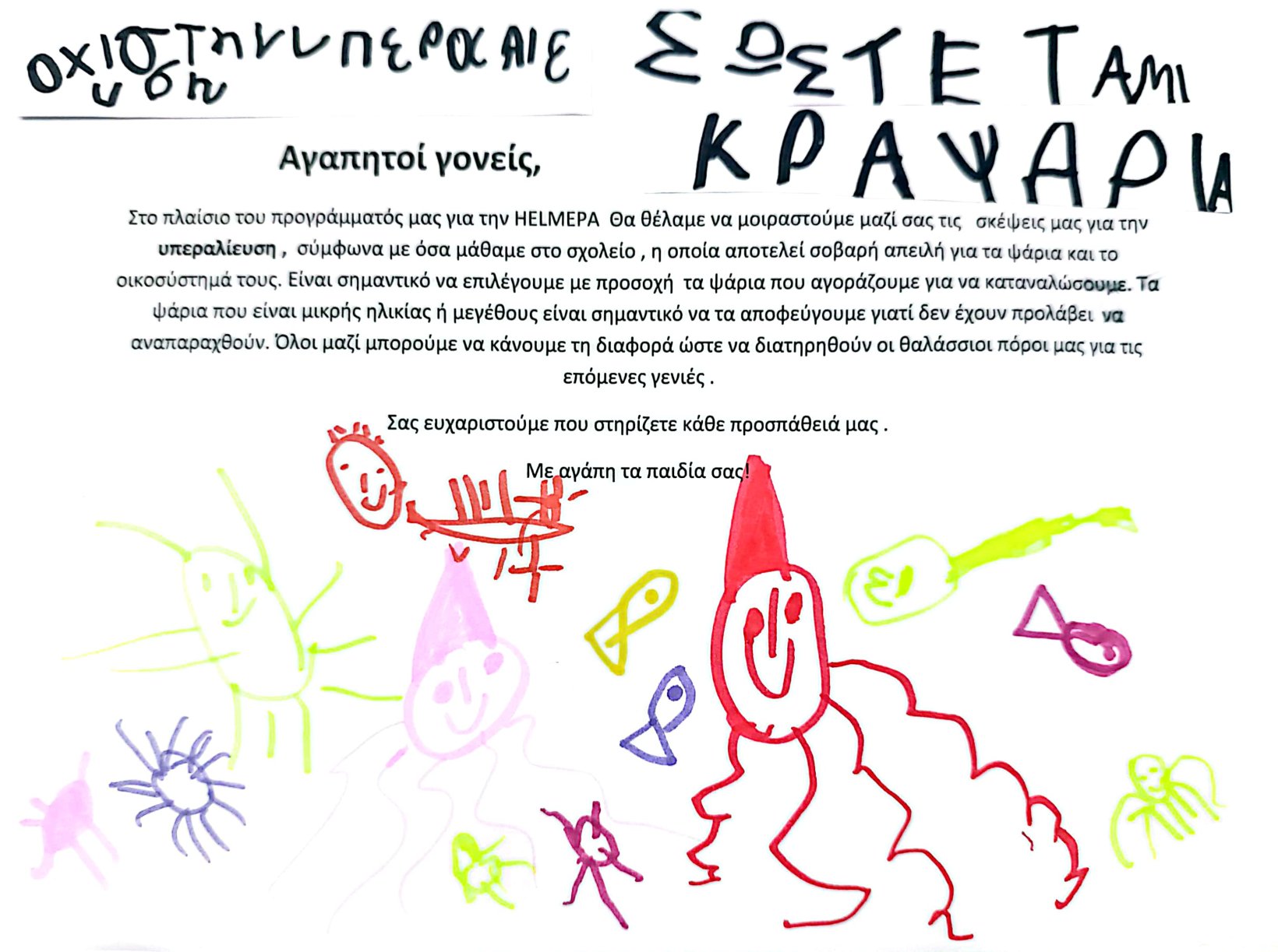 Με μεγάλη χαρά το Νηπιαγωγείο μας συμμετέχει φέτος για πρώτη φορά στο εκπαιδευτικό πρόγραμμα HELMEPA Junior, που έχει ως στόχο την καλλιέργεια της οικολογικής συνείδησης και την ευαισθητοποίηση των παιδιών για την προστασία του θαλάσσιου περιβάλλοντος.