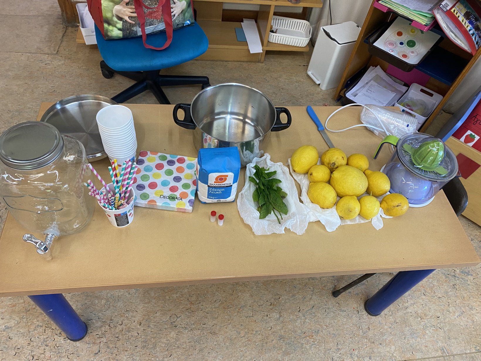 Όλα ξεκίνησαν μια μέρα που τα παιδιά μας μετά το διάλειμμα στην αυλή, έχοντας ζεσταθεί πολύ, ήθελαν κάτι παγωμένο για να δροσιστούν. Βάζοντας τους λοιπόν νερό στα ποτηράκια τους, τους προτείναμε να το ονομάζουμε δροσερή λεμονάδα και να κάνουμε ότι είμαστε έξω για πικ-νικ.