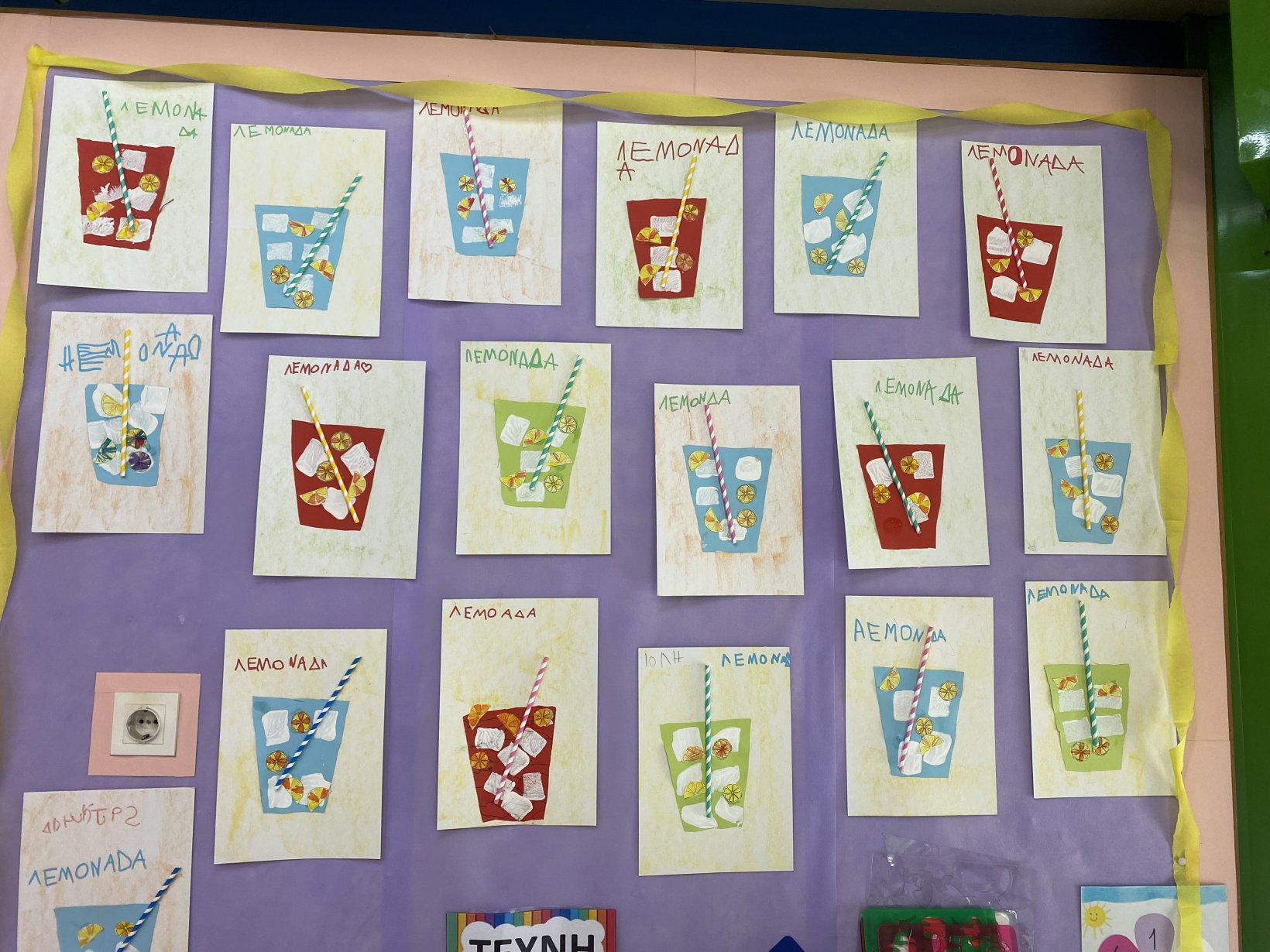 Ολοκληρώνοντας την ημέρα μας και ύστερα από τις προτάσεις των παιδιών που ήθελαν να ασχοληθούν και περαιτέρω με το θέμα αυτό, φτιάξαμε τη δική μας χάρτινη λεμονάδα σε ποτηράκια που έφτιαξαν μόνα τους τα παιδιά και με παγάκια από τα αποτυπώματα ενός σφουγγαριού…….