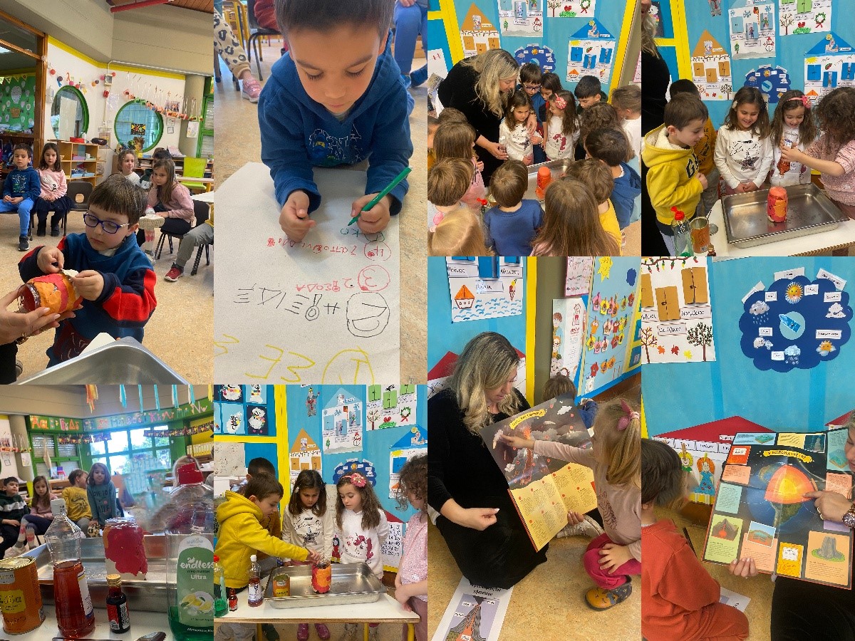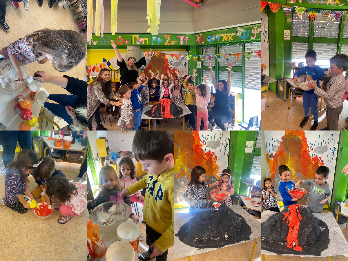 Την επόμενη ημέρα τα υλικά παρουσιάστηκαν στην ολομέλεια της τάξης, όπου τα παρατηρήσαμε, τα επεξεργαστήκαμε και τα καταγράψαμε, μαζί με τα βήματα του πειράματος σε χαρτί του μέτρου. Λίγες μέρες μετά ο Νικόλας έφερε στο σχολείο τον «‘Άτλαντα των Ηφαιστείων» (βιβλίο) τον οποίο παρουσίασε στην ολομέλεια της τάξης μαζί με την βοήθεια των εκπαιδευτικών και ξεκίνησε η έρευνα μας πάνω στα ηφαίστεια.