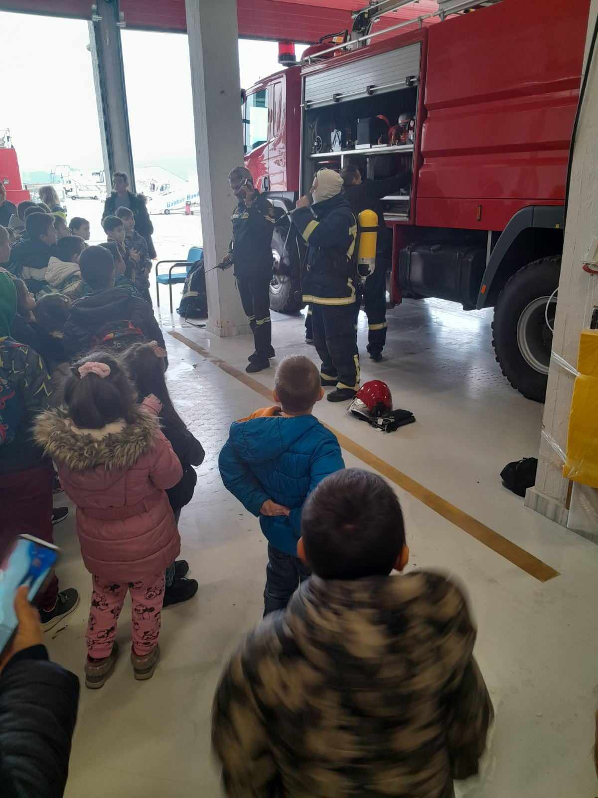 Επειτα απο την ολοκλήρωση της ξενάγησης μας στο αεροδρόμιο “Μέγας Αλέξανδρος” Καβάλας ακολούθησε η επίσκεψη μας στην Πυροσβεστική μονάδα Χρυσούπολης που βρίσκεται εντός του αεροδρομίου. Οι αξιωματικοί μας παρουσίασαν τον εξοπλισμό , την στολή τους και μας περιέγραψαν μία ημέρα στην δουλειά του πυροσβέστη. Ανεβήκαμε στο πυροσβεστικό όχημα και είδαμε το εσωτερικό του. Φορέσαμε το κράνος τους και είδαμε τις ειδικές μάνικες. Τους ευχαριστήσαμε θερμά και τους δώσαμε συγχαρητήρια για το σπουδαίο έργο τους.