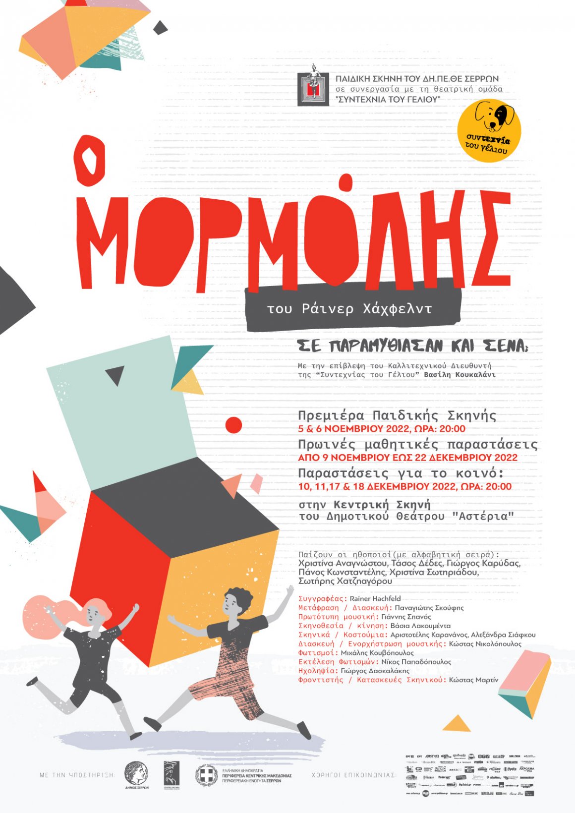 Η παιδική σκηνή του ΔΗ.ΠΕ.ΘΕ Σερρών επιλέγει φέτος να παρουσιάσει σε συνεργασία με τη θεατρική ομάδα Συντεχνία του Γέλιου την παράσταση για παιδιά “Μορμόλης” του Rainer Hachfeld.
