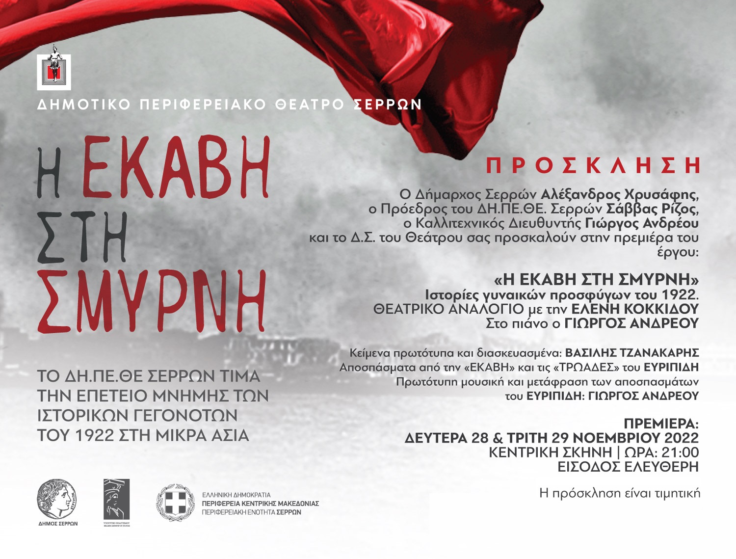 Το ΔΗ.ΠΕ.θΕ Σερρών τιμά την επέτειο μνήμης των ιστορικών γεγονότων του 1922 στη Μικρά Ασία. Για το λόγο αυτό τη Δεύτερα 28 Νοεμβρίου και την Τρίτη 29, στις 21.00, στην κεντρική σκηνή του Δημοτικού Θεάτρου Αστέρια, θα πραγματοποιηθεί θεατρική παράσταση με τίτλο “Η Εκάβη στη Σμύρνη“. Η είσοδος για το κοινό είναι ελεύθερη.