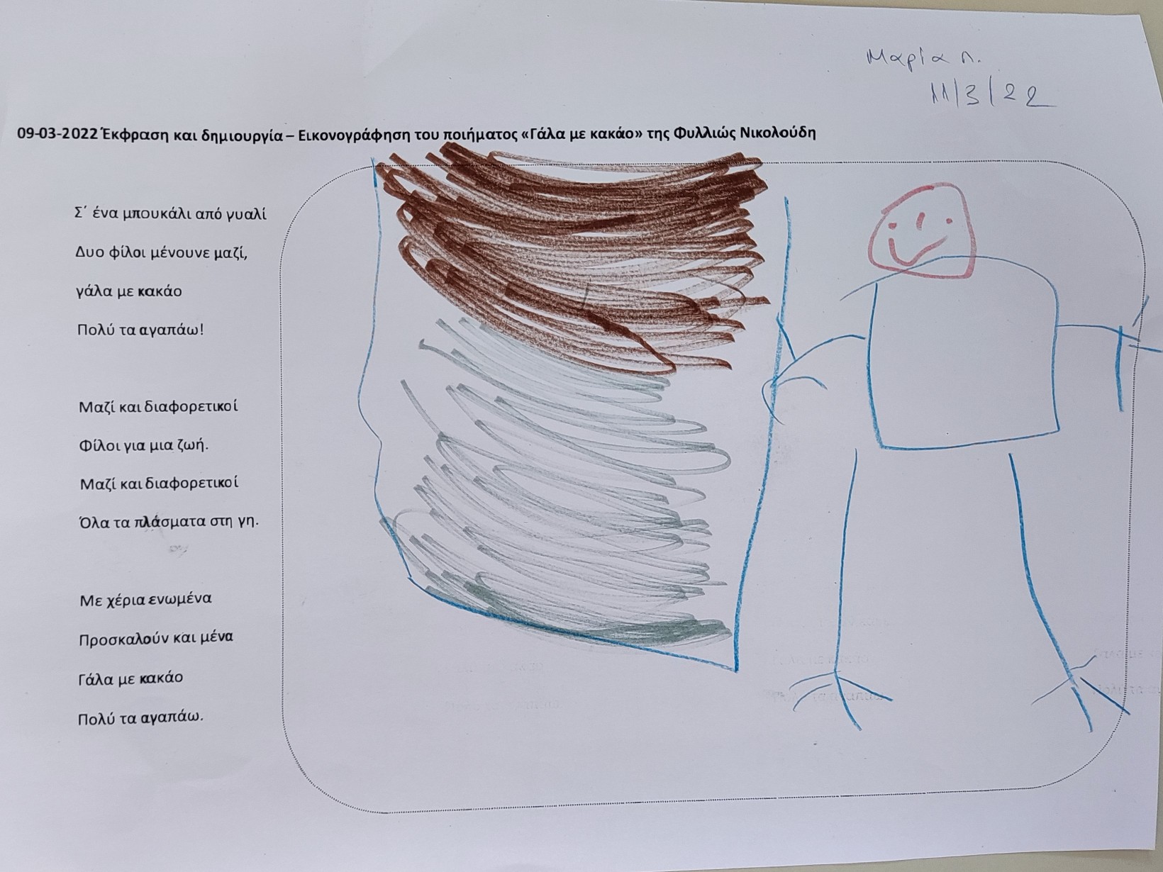 Ξεκινώντας την ενασχόλησή μας με τη διαφορετικότητα και τα δικαιώματα των παιδιών, πήραμε ερεθίσματα από το ποίημα της Φυλλιώς Νικολούδη : « Γάλα με κακάο» που βασίζεται στο υπέροχο παραμύθι της: “Καλημέρα φίλε”. Το βρήκαμε στο περιοδικό : «Σύγχρονο Νηπιαγωγείο», τεύχος 47.