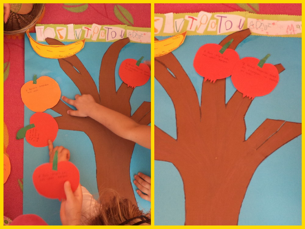 Ζητάμε από κάθε παιδί να μας αφηγηθεί μια ιστορία ή ένα κατόρθωμα για το οποίο είναι υπερήφανο. Η νηπιαγωγός καταγράφει με απλές λέξεις την ικανότητα που είναι υπερήφανο κάθε παιδάκι. Έχουμε ετοιμάσει ένα δέντρο ………………Στη συνέχεια τα νήπια επιλέγουν ένα από τα φθινοπωρινά φρούτα όπου γράφουμε πάνω γιατί είναι περήφανα για τον εαυτό τους…………..